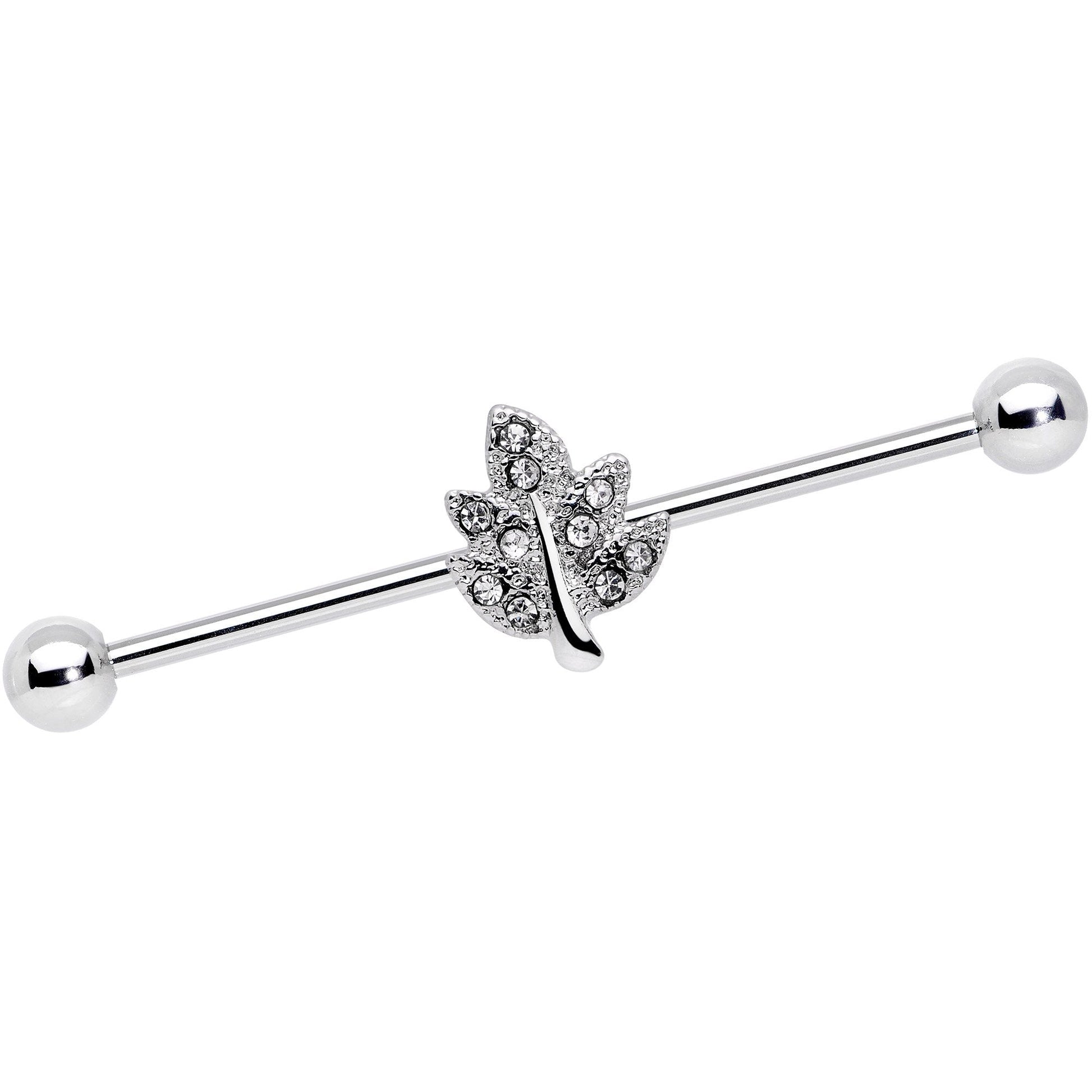 Whether you're a proud Canadian, a syrup specialist, or have a taste for trees this 14 gauge industrial jewelry will be exactly your speed! It's made with a 1 1/2" durable 316L surgical grade stainless steel straight barbell and features a moveable maple leaf charm paved in clear gems. Grab a plate of pancakes and let the world know that you're the maestro of maple leaves!