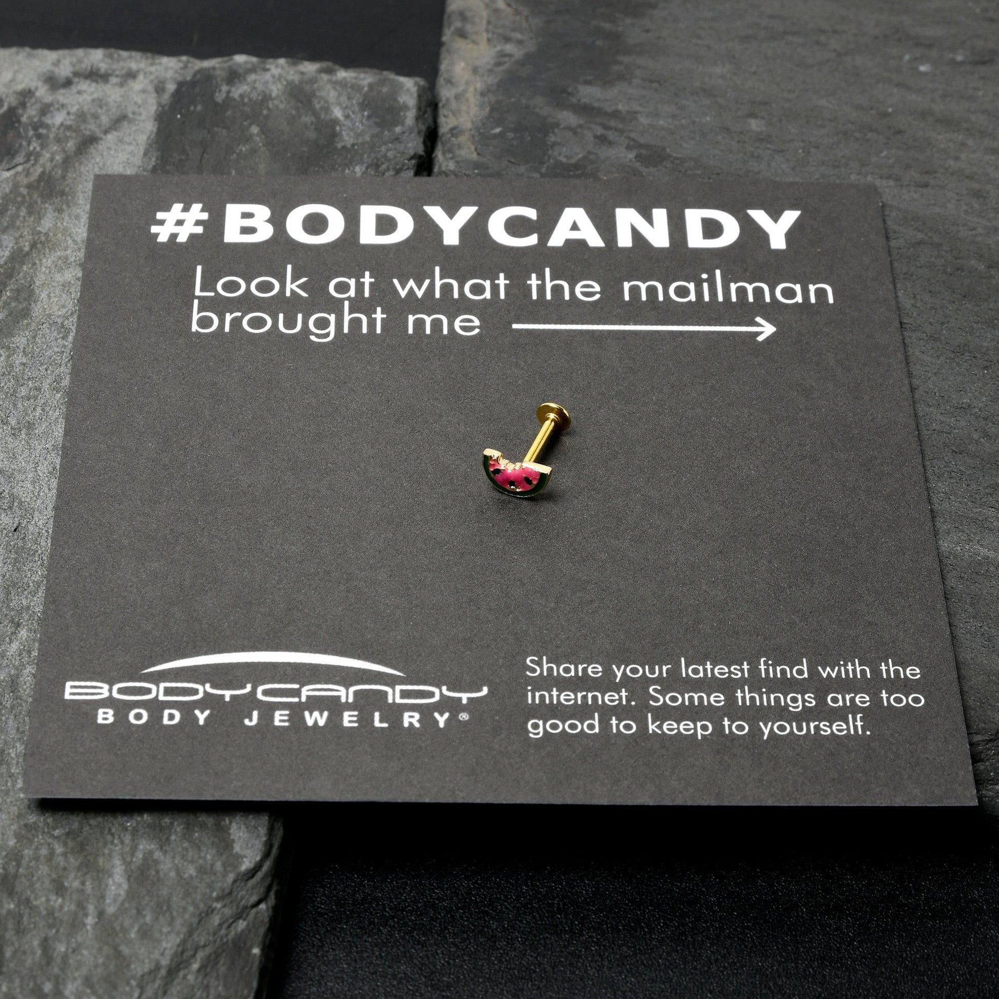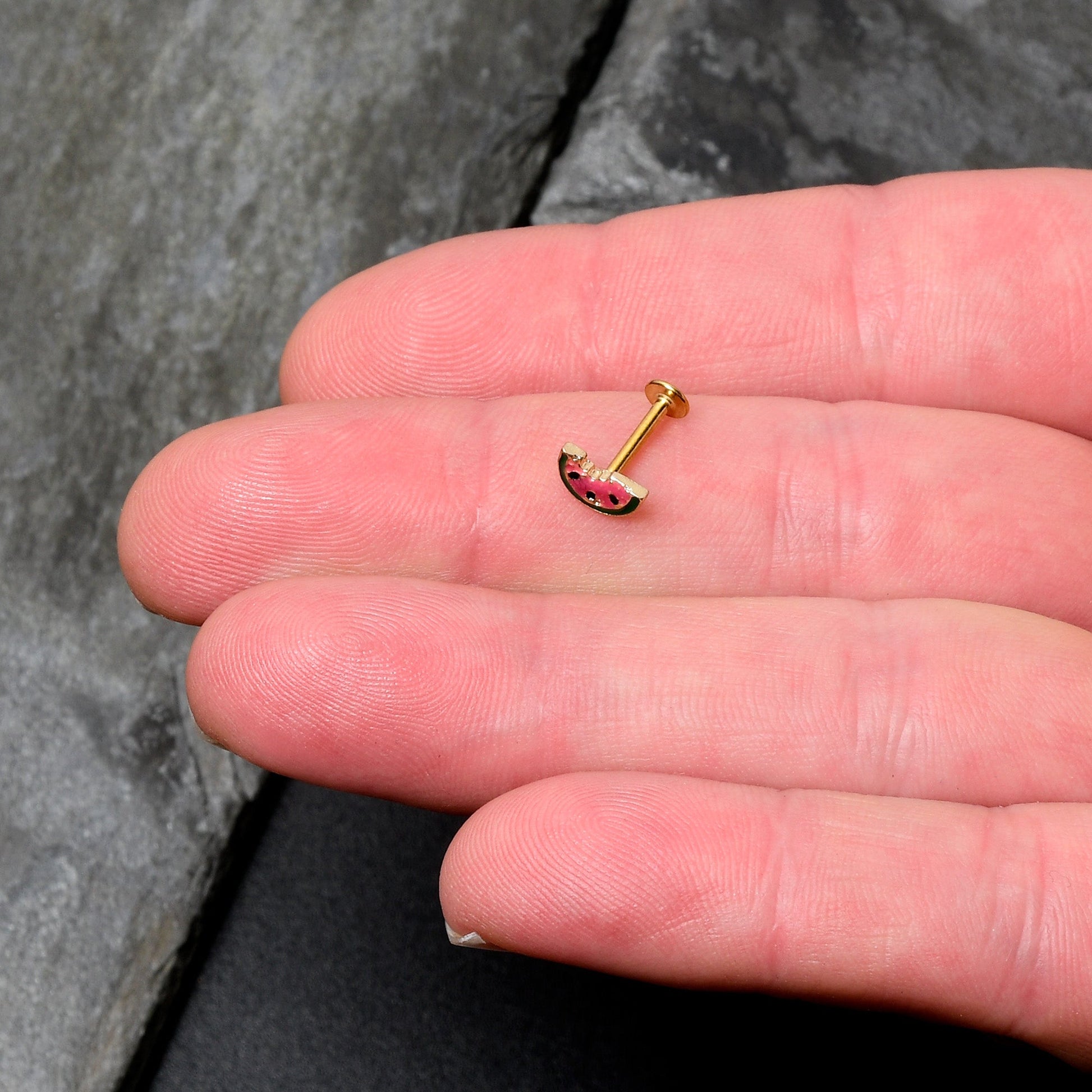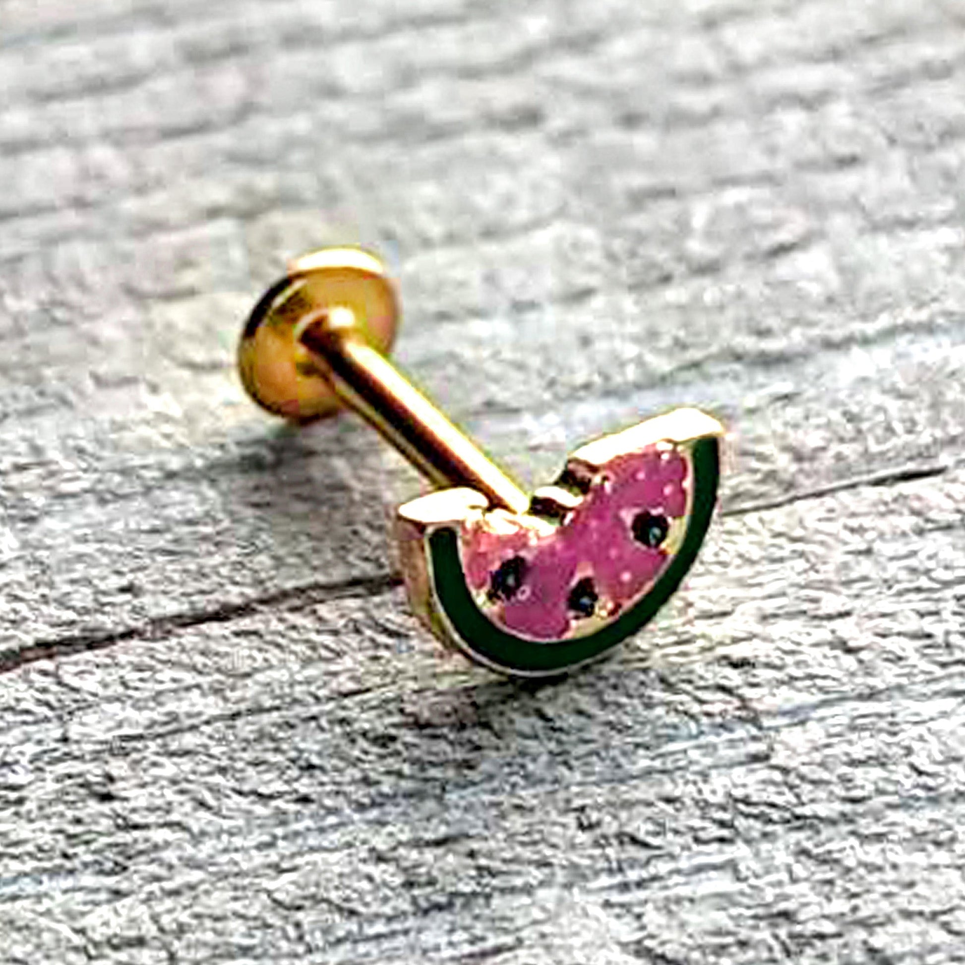 Take a bite of style with this tasty 16 gauge lip ring. It is made with an 8mm gold tone PVD over 316L surgical grade stainless steel straight post with a flat disc end. It features a watermelon slice charm, inlaid in red and green with black seed embellishments. The tasty fruit even has a bite already taken out and you can rock it in multiple piercings including lip, monroe, tragus, helix, and some conch piercings. You too will find this yummy melon cartilage piercing ring irresistible.