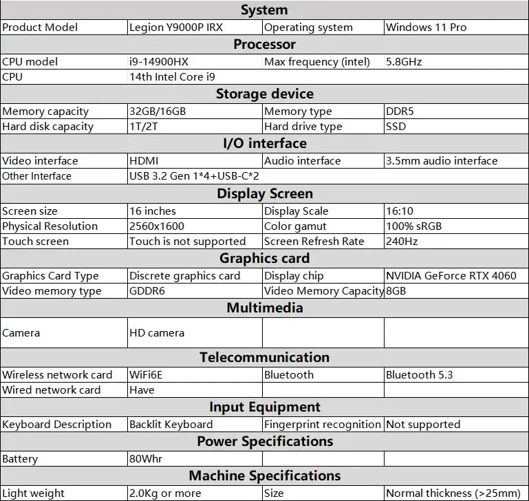 Lenovo Legion Y9000P Gaming E-Sports Laptop 2024 RTX 4060 Intel i9-14900HX 16" 16/32/64G RAM 1/2T SSD 2.5K 240Hz Notebook PC
