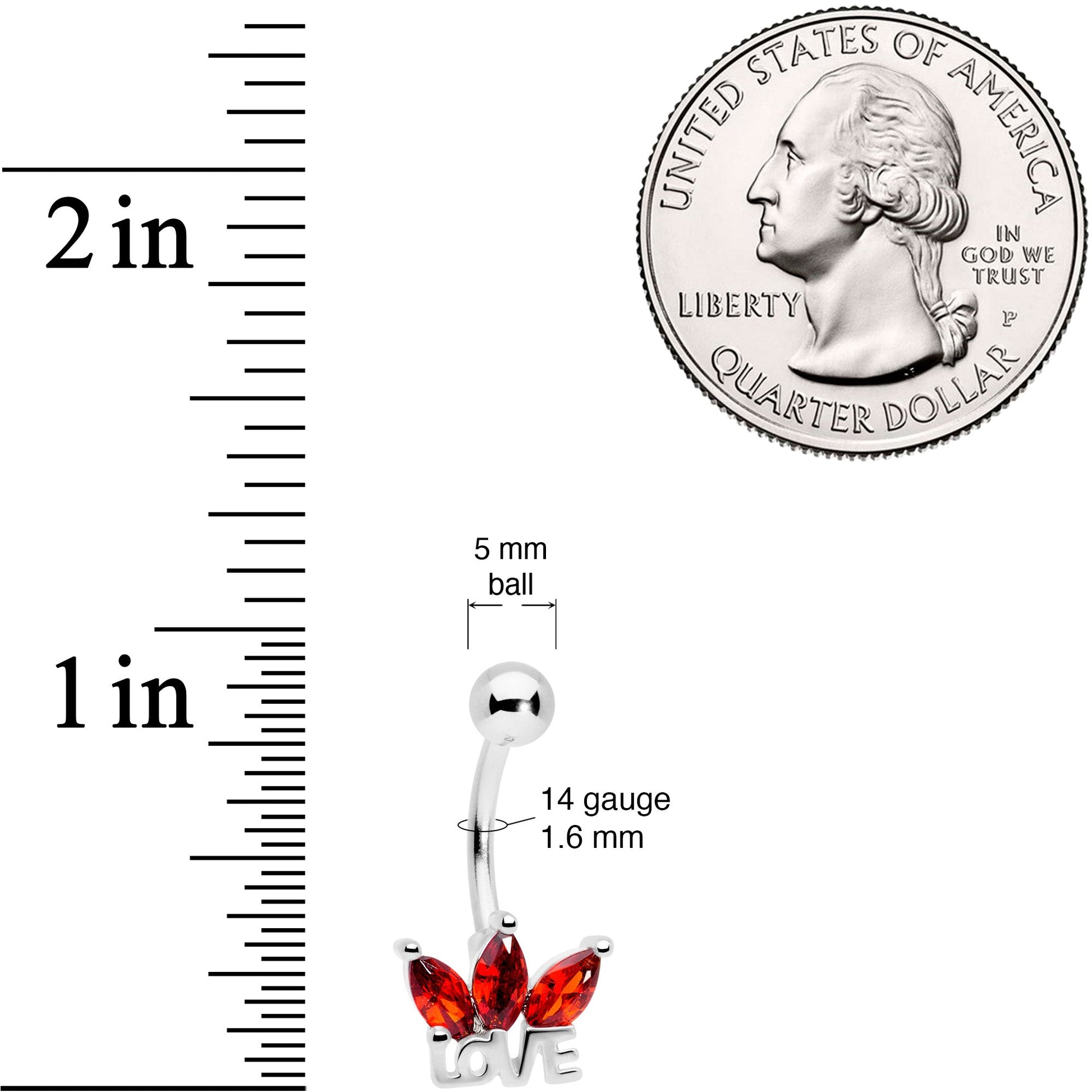 Show the world that love is king...or queen...with this 14 gauge navel jewelry! It's made with a 7/16" durable 316L surgical grade stainless steel curved barbell with a 5mm top ball end. The bottom end features a trio of red gems fanned out over the word "love" like a royal crown. Spread love whether it's Valentine's Day or not when you wear love with this elegant and timely belly button ring.Specifications