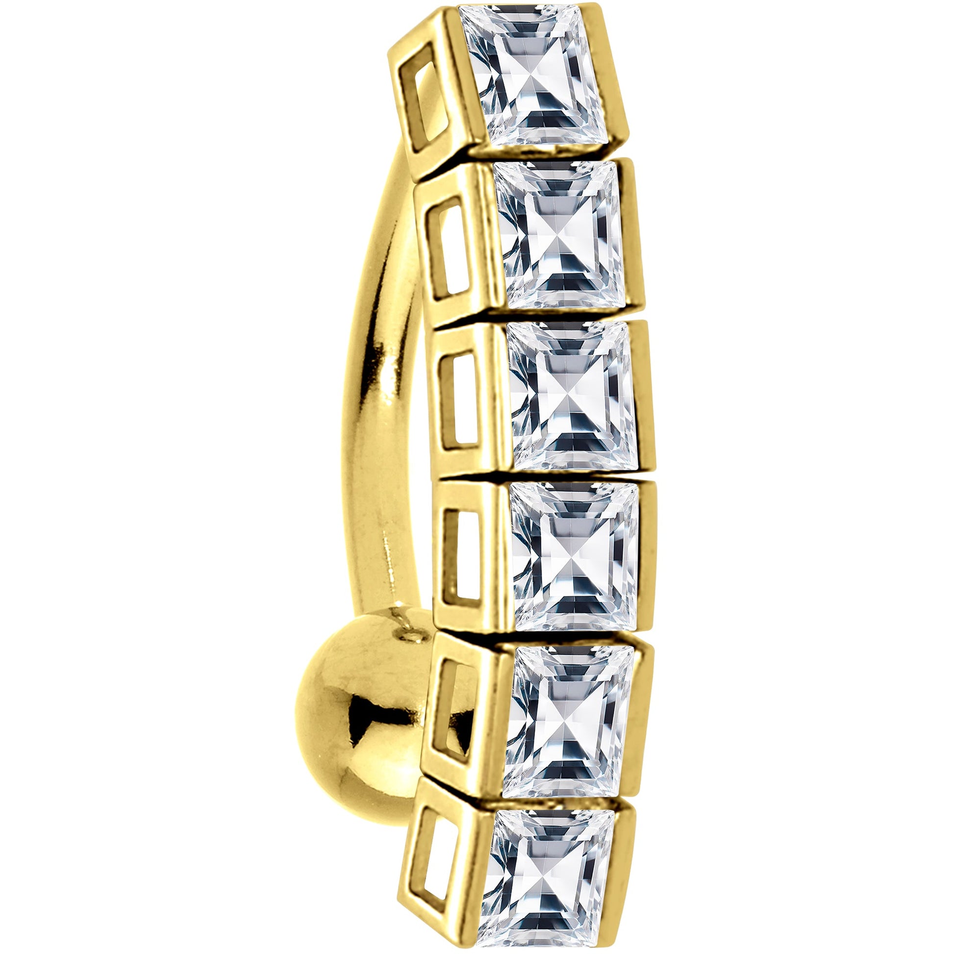 Show off your top style with this top mount solid yellow gold belly ring. This cubic zirconia CZ belly button ring featuring 6 dazzling square shaped CZ stones.
