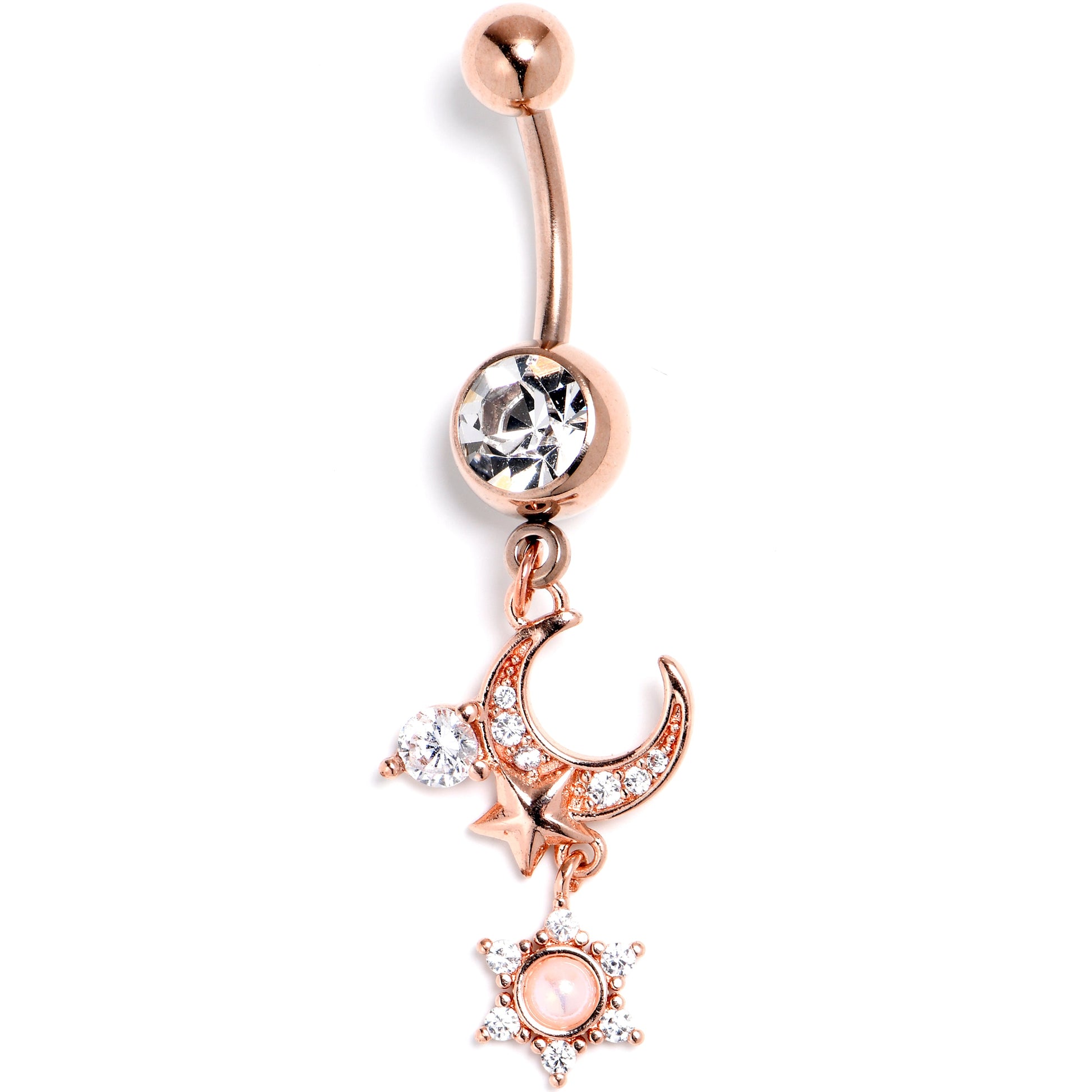 Clear CZ Gem Rose Gold Tone Moon Star Dangle Belly Ring