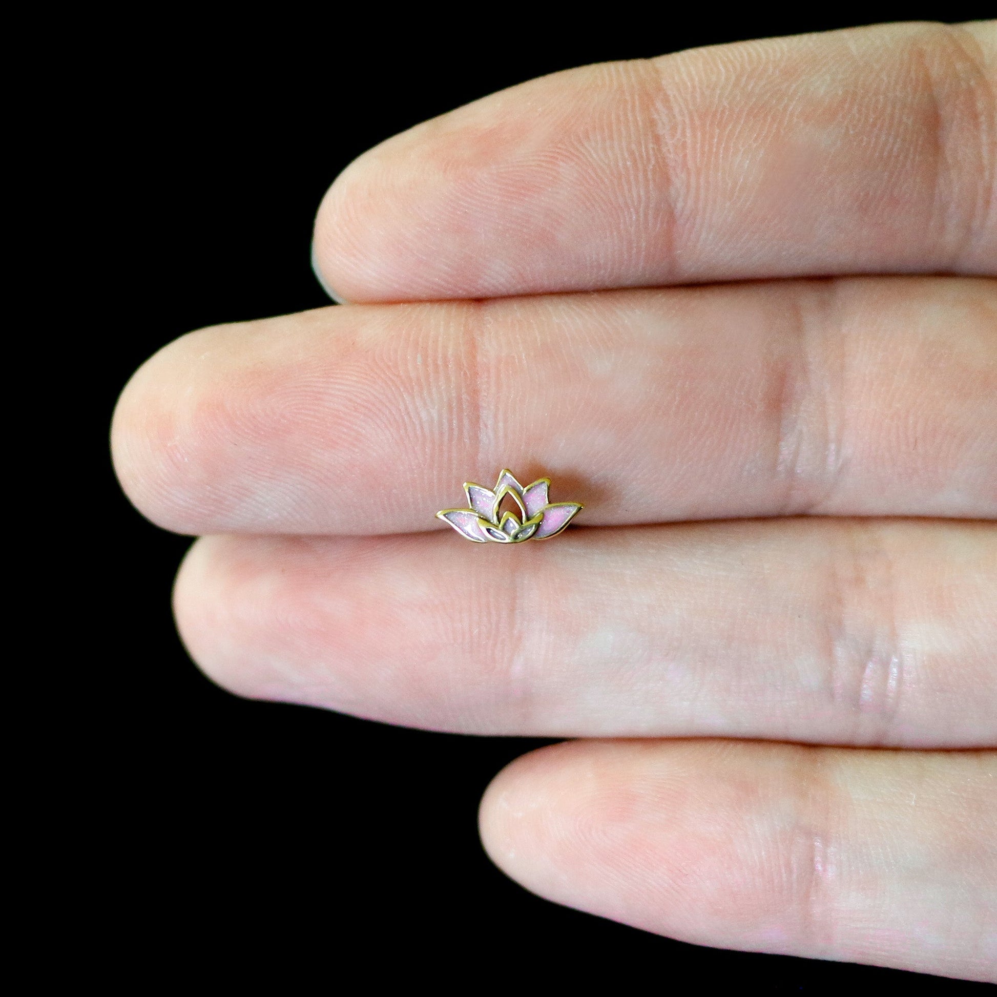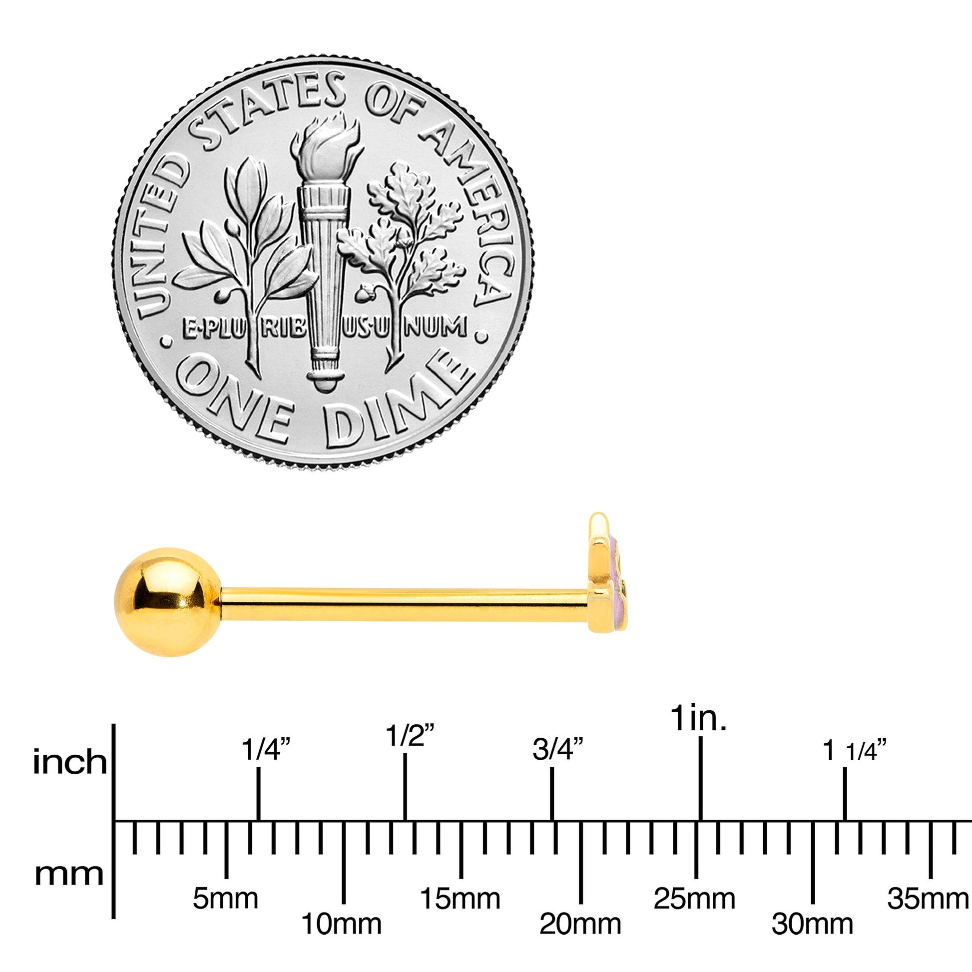 Let your words speak of peace with this 14 gauge tongue piercing jewelry! It's made with a 5/8" gold tone PVD over 316L surgical grade stainless steel straight barbell with a 5mm bottom ball end. The top end features a lotus flower charm, with matching trim. The lotus is further embellished with pink inlay for a soothing touch of color that doesn't overwhelm the overall look. You'll be feeling pretty and peaceful when you're rocking this stylish and spiritual tongue ring!