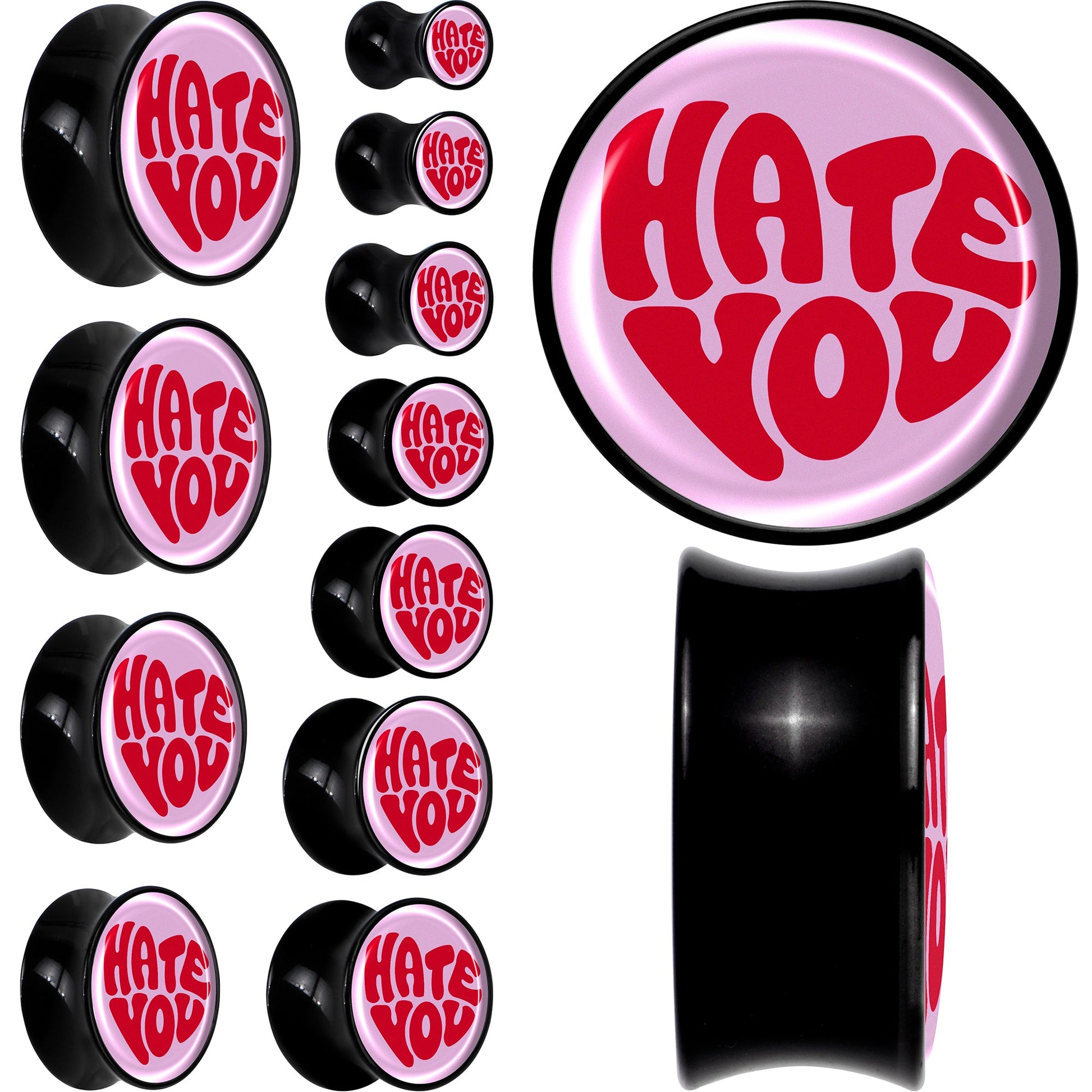 Say what you mean and mean what you say with these saddle plugs for stretched lobes. They're made with acrylic and feature a saddle design for comfortable insertion and removal. They feature disc shaped charms that feature a logo inlay of a pink background with a "hate you" message in red. Let the world know when to stay away with these charmingly blunt pierced ear gauges. Sold as a set of two.