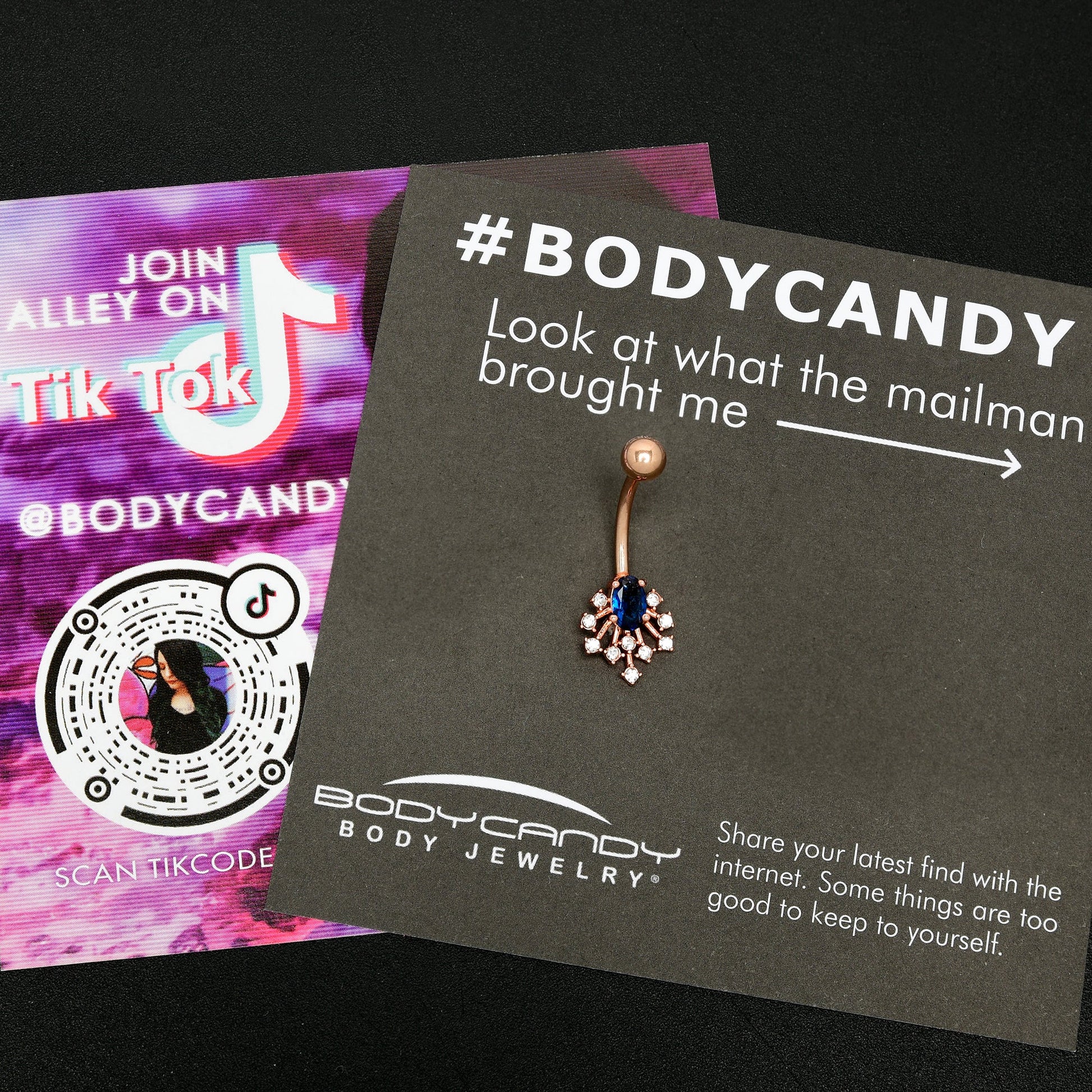 The flare on this 14 gauge navel ring is going to add a ton of flair to your look! It's made with a 3/8" rose gold tone PVD over 316L surgical grade stainless steel curved barbell with a 5mm top ball end. The bottom end features a blue gem oval charm, surrounded by rays tipped with clear gem ends for a firey look! You'll be enjoying a fashion flareup when you're rocking this colorful belly piercing ring!Specifications