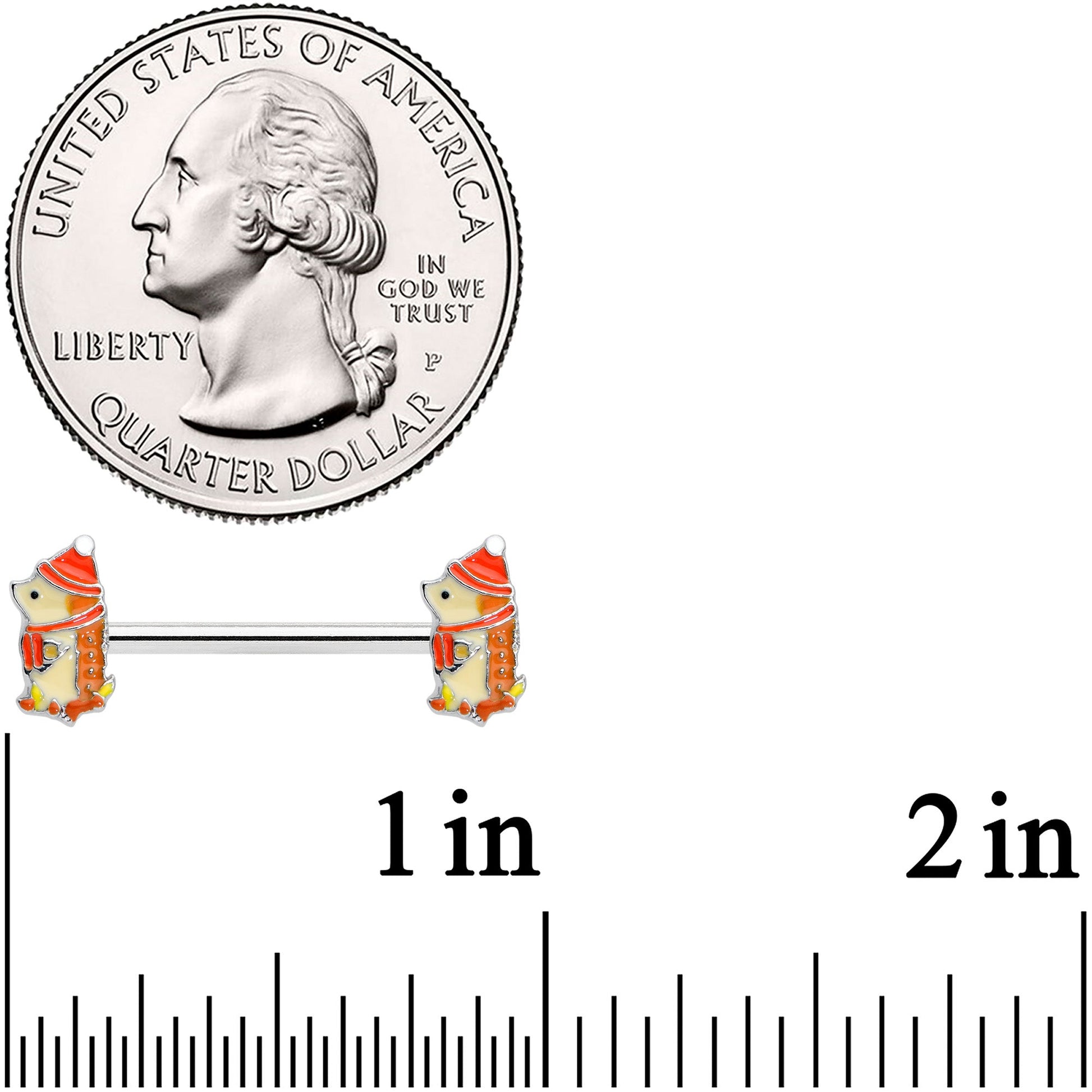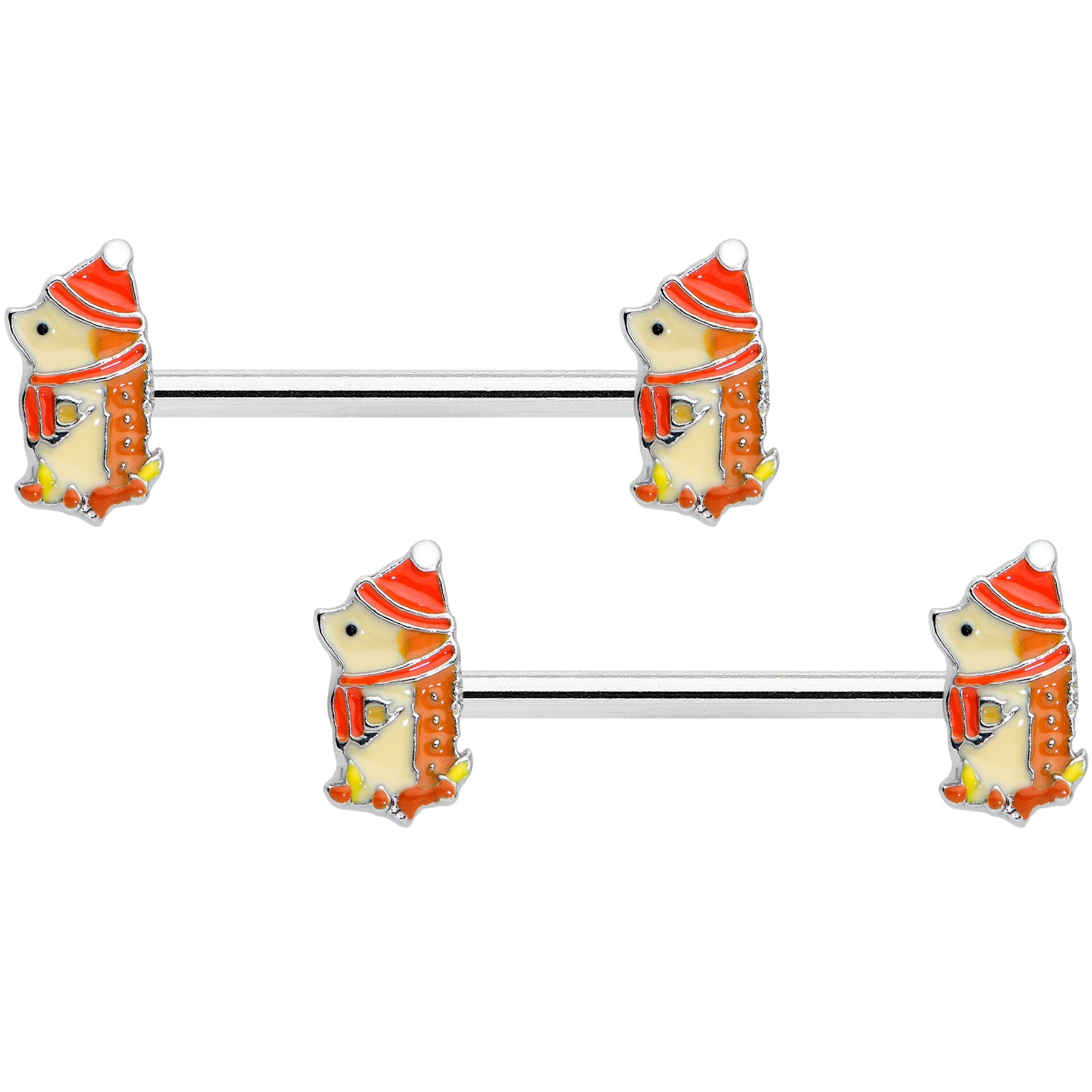 The spiky fellows on this 14 gauge nipple jewelry are all bundled up for the winter! It's made with 14mm durable 316L surgical grade stainless steel straight barbells. Each of the ends features a hedgehog charm, with a white body and tan snout. The hedgehogs are each bundled up in an orange hat and scarf to keep the chill away. These sweet little hedgehog nipple piercing rings are sure to warm your heart! Sold as a set of two.