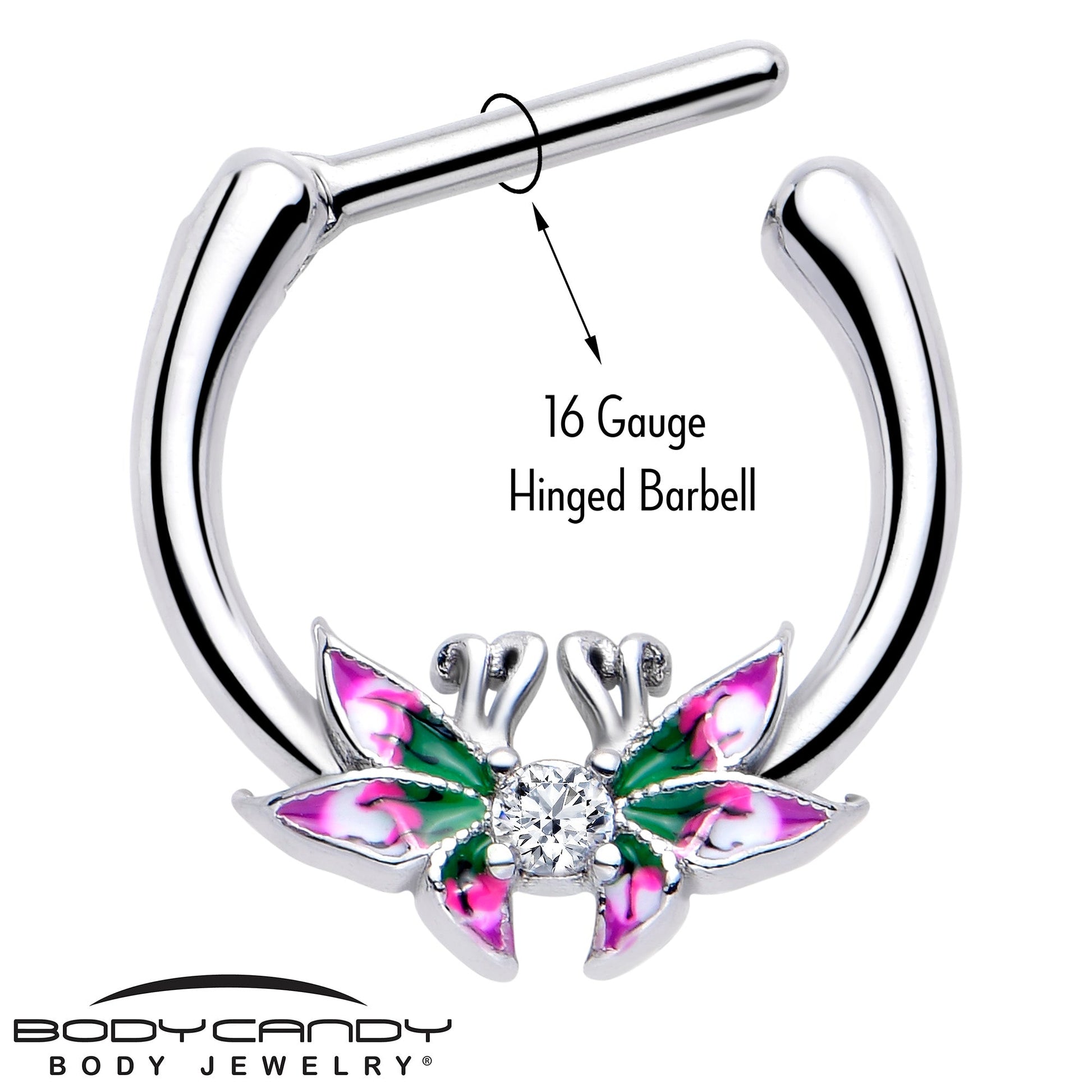 You won't be keeping a low profile when you are rocking this 16 gauge septum ring. It is made with an 8mm durable 316L surgical grade stainless steel hinged straight barbell. It features a pair of purple, pink, green, and white inlaid butterfly charms, seen in profile to give you the best possible view of the wings and with a clear cubic zirconia gem set between them. It also features a hinged, clicker design that makes insertion and removal a snap and you can even rock it in multiple piercings including tragus, helix, and some conch piercings. You will be looking picture perfect with this delightful butterfly cartilage piercing jewelry.