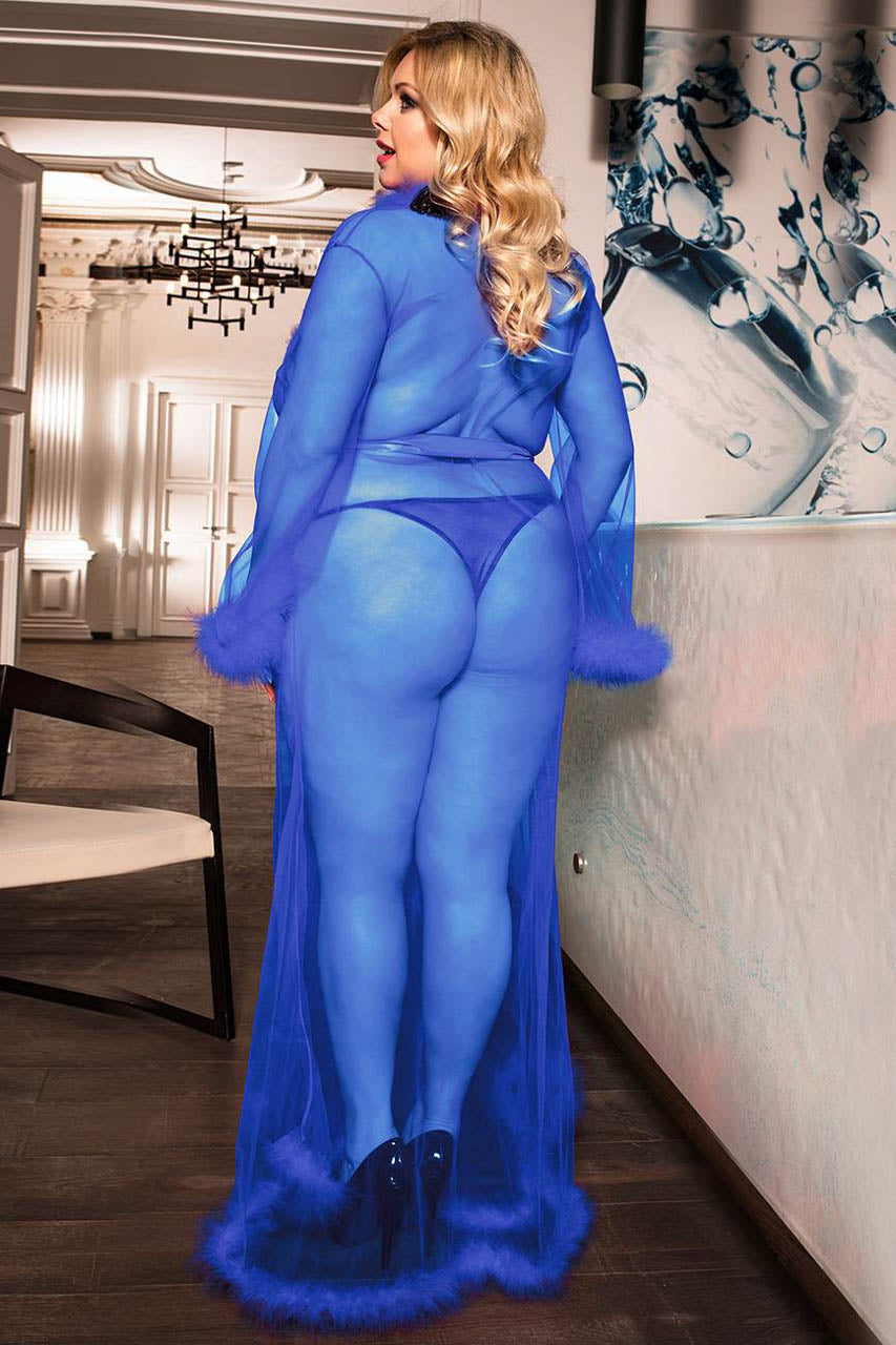 This Glamorous, plus size, deluxe mesh robe features a floor-length design, marabou trim, belt, and panty.