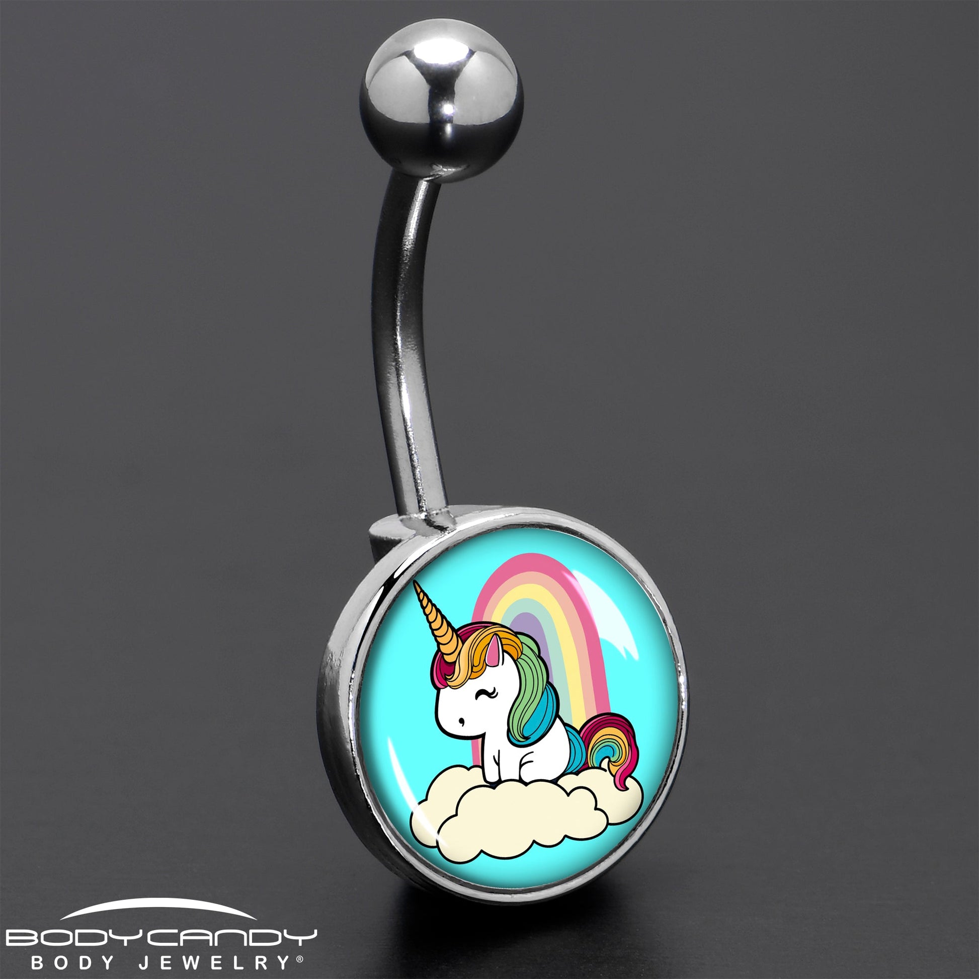 If you are one in a million, you will totally love the colorful unicorn on this 14 gauge navel ring. It is made with a 7/16 inch 316L surgical grade stainless steel curved barbell with a 5mm top ball end. The bottom end features a blue disc with a unicorn on it. Not only is the unicorn sitting in front of a rainbow, but it also has rainbow stripes in its mane and tail. Take pride in your uniquely colorful self with the charming unicorn on this belly piercing jewelry.