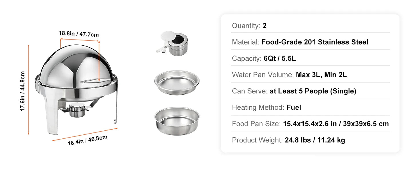 Warm and Fresh: VEVOR's roll top chafing dish buffet set allow you to maintain the food's temperature. Supported by fuel holders, our dish can heat food. Besides, you can also add enough ice to the water tray for cooling the food.