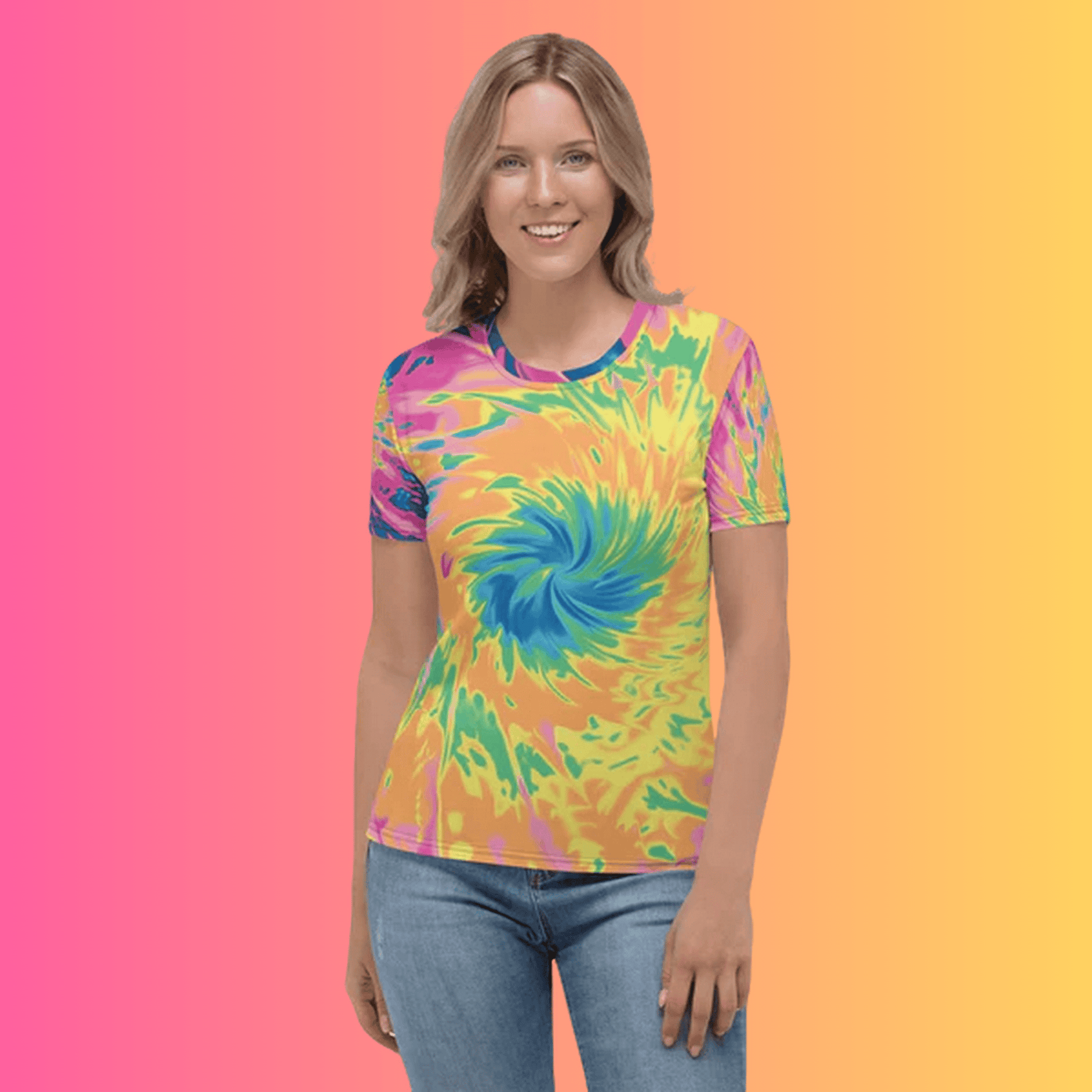 Elevate your festival game with our Vibrant Tie-Dye Women's T-Shirt! Picture yourself in the heart of the party, surrounded by electrifying beats and dazzling lights, all while flaunting your one-of-a-kind style. This playful tee isn't just a garment; it's an expression of your love for music and celebration, crafted to make you the star of any gathering.