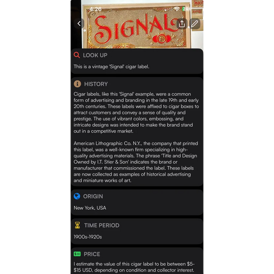 Rare Antique Vintage Signal Embossed Cigar Label from Early 1900s