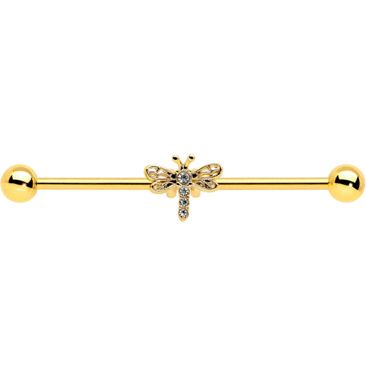 14G Clear Gem Gold Tone Flying Dragonfly Industrial Barbell 38mm
