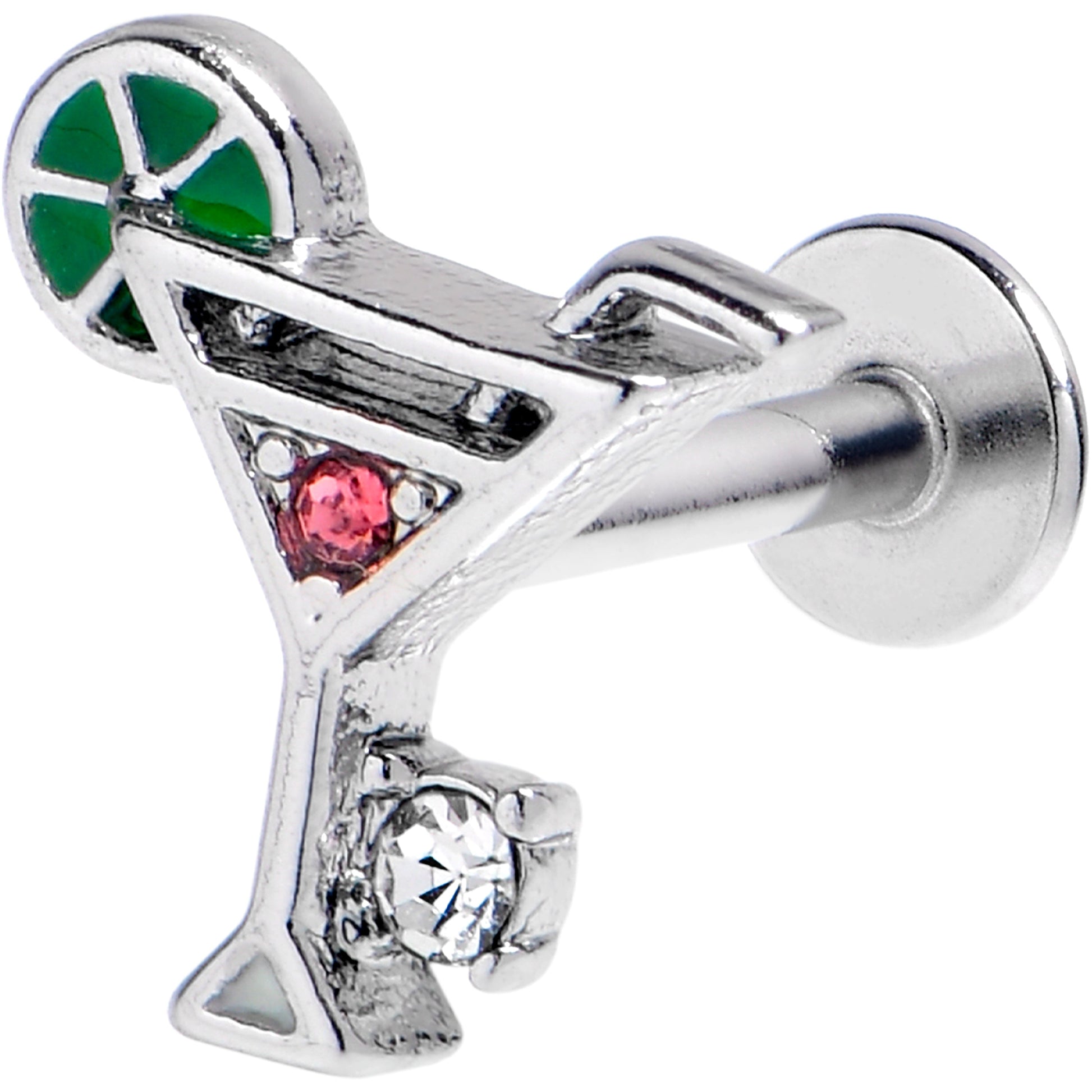 Bottoms up for style, with this 16 gauge lip ring. It is made with a 6mm durable 316L surgical grade stainless steel straight post with a flat disc end. It features a martini glass charm, with a pink gem center and green fruit slice embellishment. It also features a clear gem to one side to give the look of a stray ice cube and you can rock it in multiple piercings including tragus, helix, and some conch piercings. Drink in the compliments when you're rocking this cocktail-themed cartilage piercing jewelry.