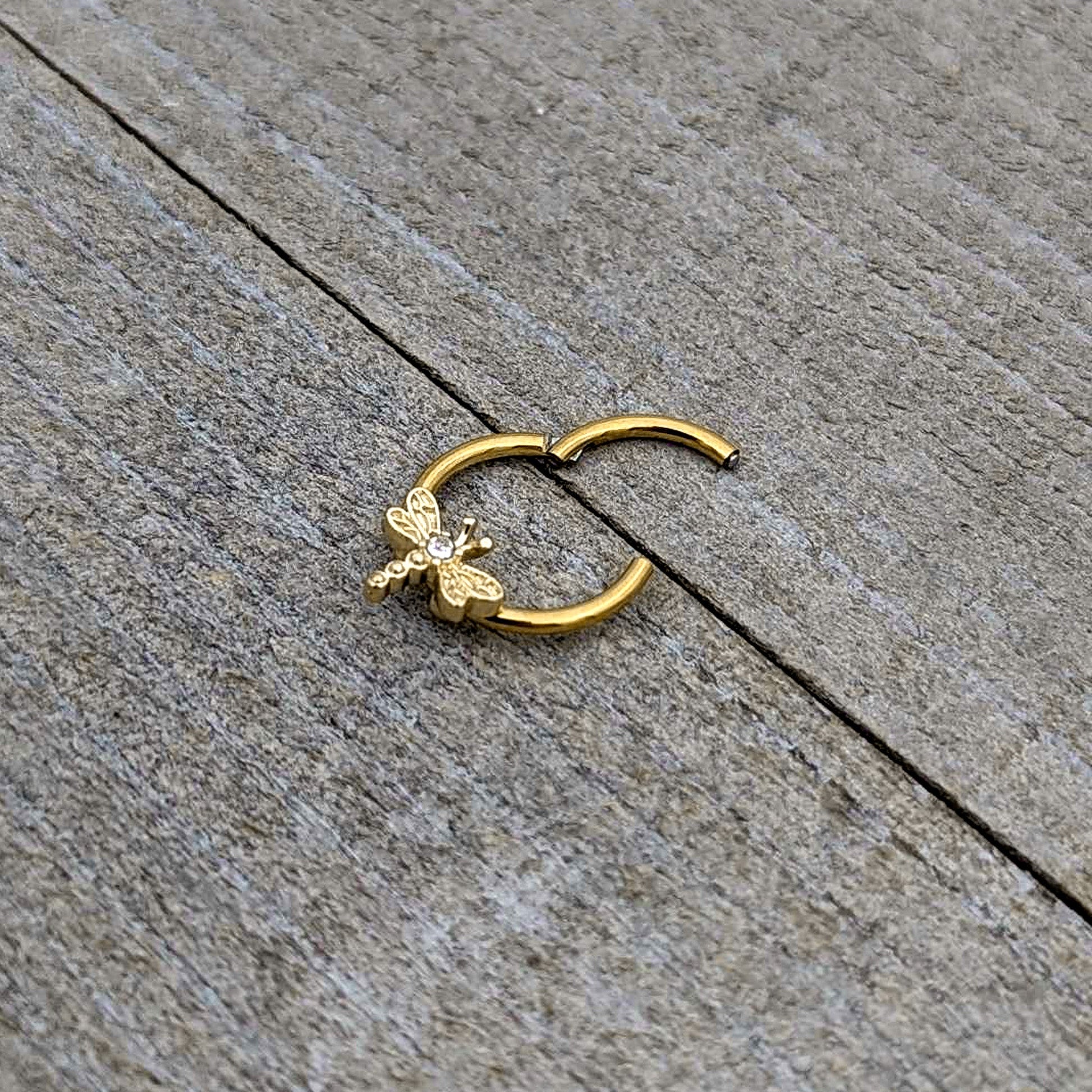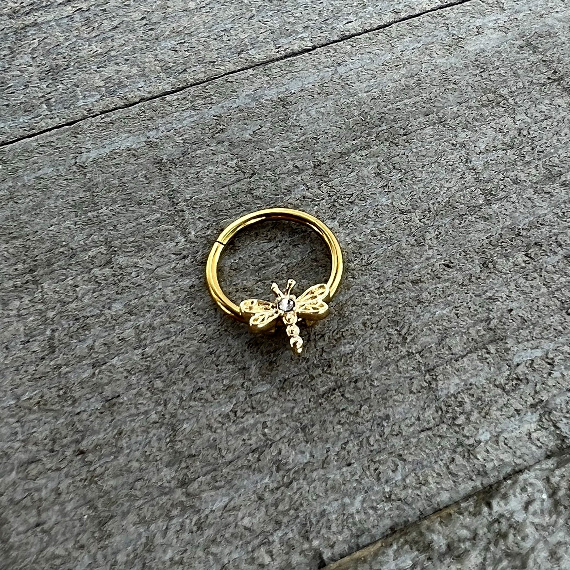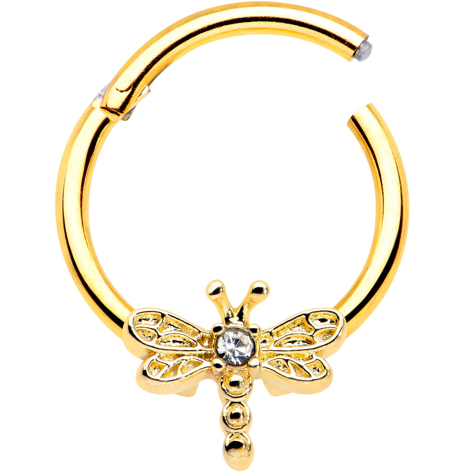 Let your look soar with this 16 gauge septum ring! It's made with a 10mm gold tone PVD over 316L surgical grade stainless steel hinged circular ring. It features a dragonfly charm. The dragonfly has openwork wings, textured tail, and a body set with a small clear gem. It also features a non-removable, hinged segment that makes insertion and removal a breeze and you can rock it in multiple piercings including tragus, helix, and some daith piercings. You'll want to fly too when you're rocking this darling, dragonfly cartilage piercing jewelry!