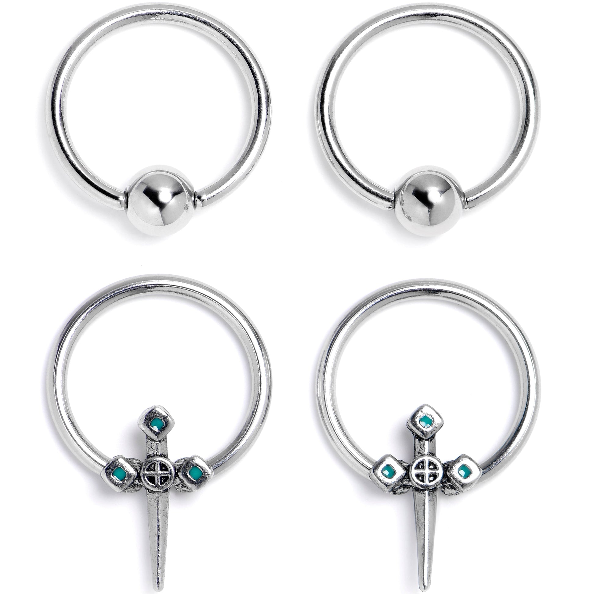 Whether you have a lot of piercings or like a cohesive look, this set of 16 gauge septum rings has you covered. They are made with 10mm durable 316L surgical grade stainless steel circular rings. Two have simple matching captive beads for a classic appearance. The other two feature captive dagger charms, with the daggers embellished with geometric designs and green detail. They feature a captive design for secure wear and you can even rock these in multiple piercings including helix, daith, and some conch piercings. You will be ready for anything with this medieval styled, classic cartilage piercing jewelry. Sold as a set of four.Specifications