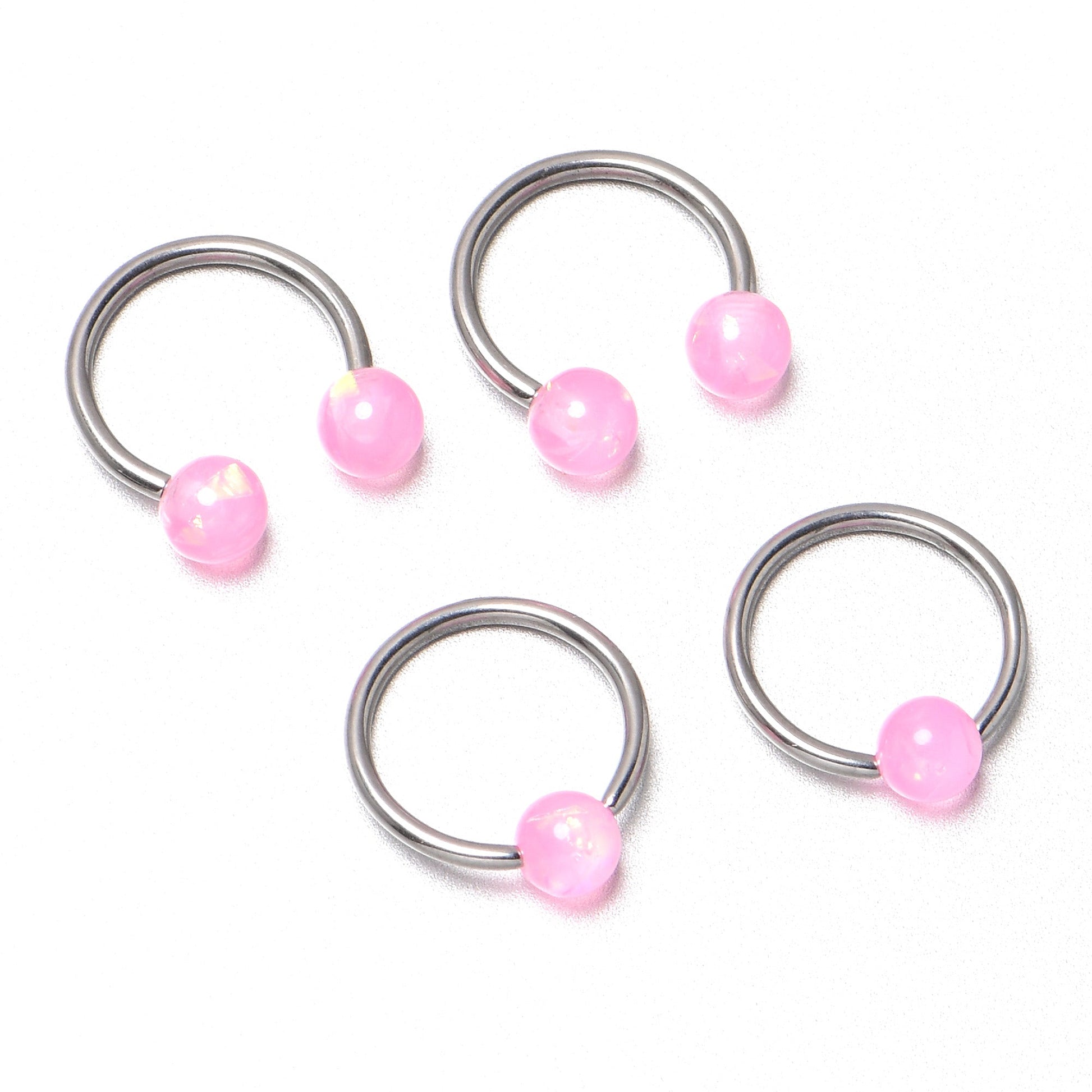 These 16 gauge septum rings will keep you covered if you like your piercings to match and keep your look on trend. Two are made with 10mm durable 316L surgical grade stainless steel circular barbells..They feature 4mm pink faux opal ball ends. The other two are 10mm durable 316L surgical grade stainless steel circular rings. They feature pink faux opal captive beads for matching style. You can even rock them in multiple piercings including tragus, helix, daith, and some conch piercings. Whether you mix or match, keep it on trend with this fabulous cartilage piercing jewelry. Sold as a set of four.Specifications