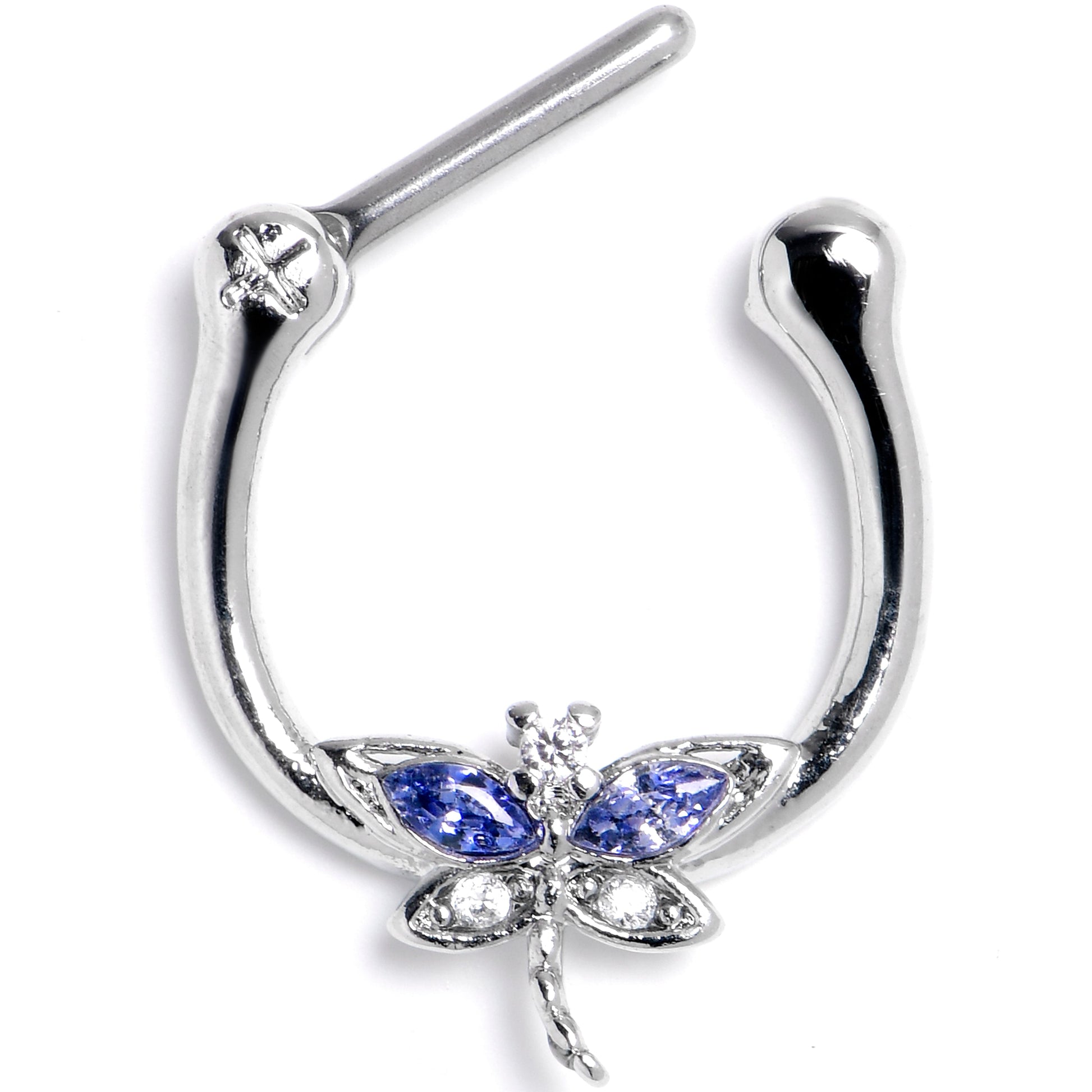 Dragonflies are constantly on the move so sometimes they just want to.....hang out. This 16 gauge septum ring is made with an 8mm durable 316L surgical grade stainless steel hinged straight barbell. It features a classic dragonfly charm, with the wings set with blue cubic zirconia gems in the top wings. The dragonfly is further embellished with clear cubic zirconia gems in the lower wings and textured head and body. It also features a hinged, clicker design that makes insertion and removal a snap and you can even rock it in multiple piercings including tragus, helix, and some conch piercings. You will want to hang out with this dragonfly cartilage piercing jewelry all the time.Specifications
