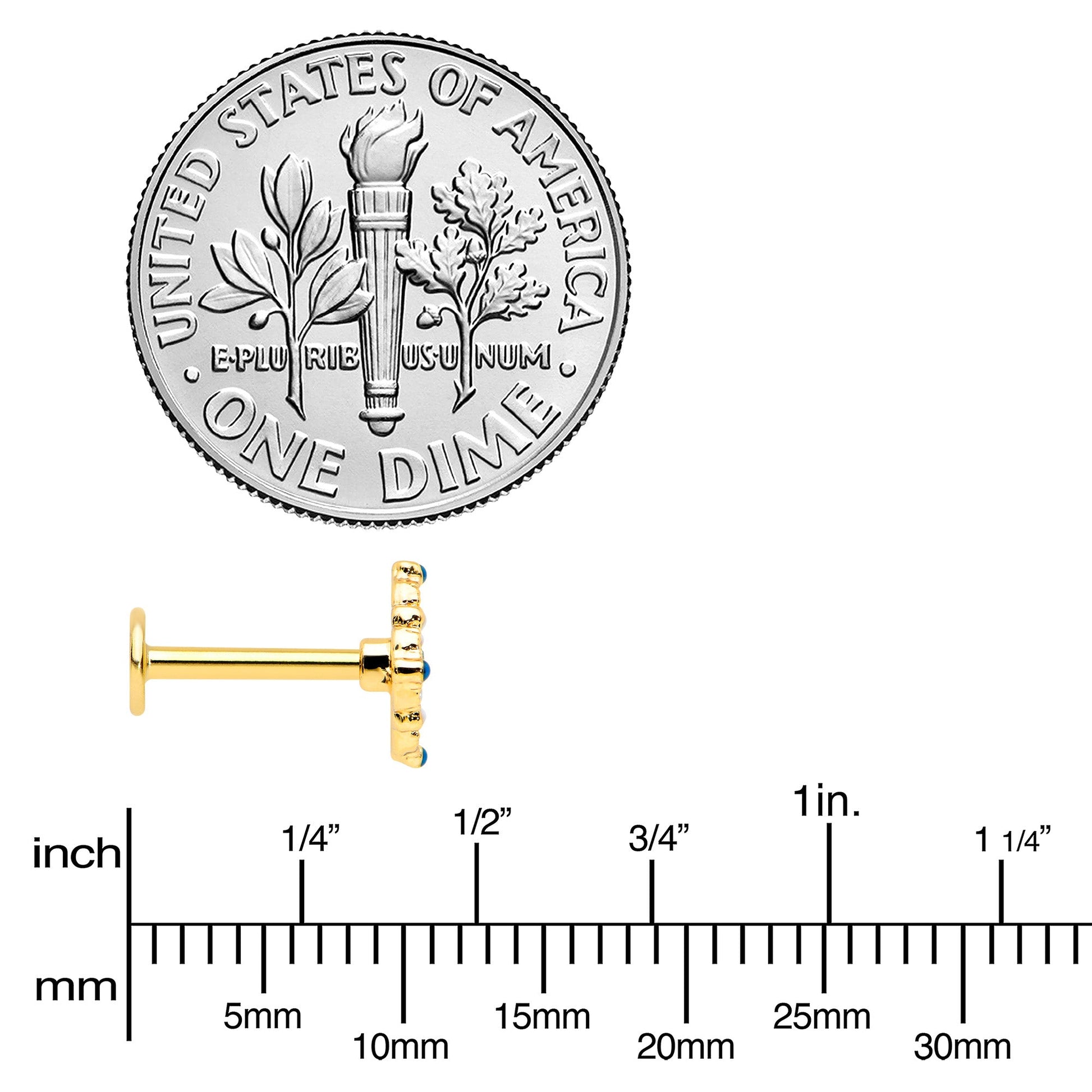 Let this 16 gauge lip ring get your look all laced up! It's made with an 8mm gold tone PVD over 316L surgical grade stainless steel straight post with a flat disc end. It features a lacy styled black charm, set with a blue gem center. It's further embellished with blue and white along the edges and textured detailing. You can even rock it in multiple piercings including lip, monroe, tragus, helix, and some conch piercings. You're going to love the look of lace when you're rocking this airy, lace-inspired cartilage piercing jewelry.