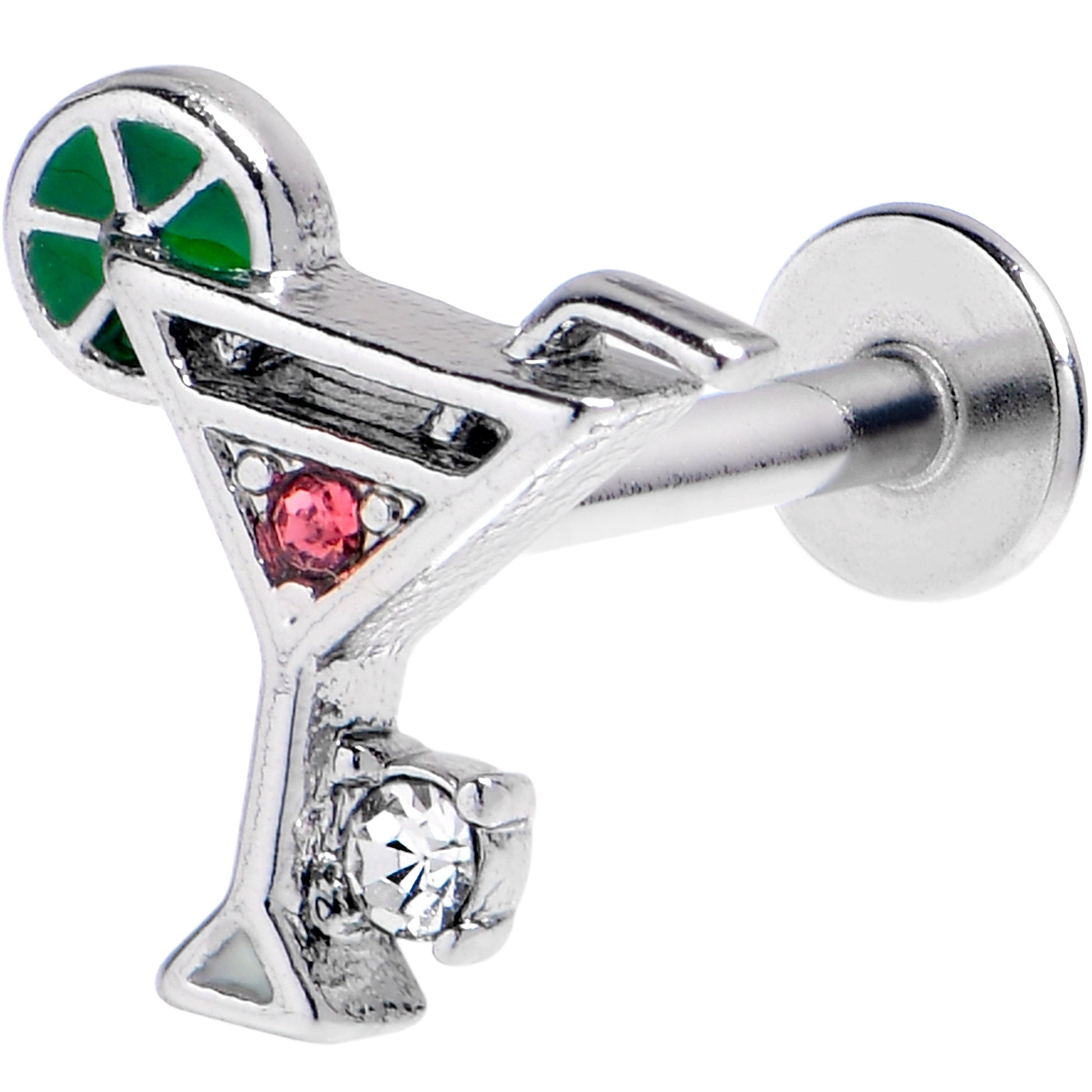 Bottoms up for style, with this 16 gauge lip ring. It is made with an 8mm durable 316L surgical grade stainless steel straight post with a flat disc end. It features a martini glass charm, with a pink gem center and green fruit slice embellishment. It also features a clear gem to one side to give the look of a stray ice cube and you can rock it in multiple piercings including lip, monroe, tragus, helix, and some conch piercings. Drink in the compliments when you're rocking this cocktail-themed cartilage piercing jewelry.