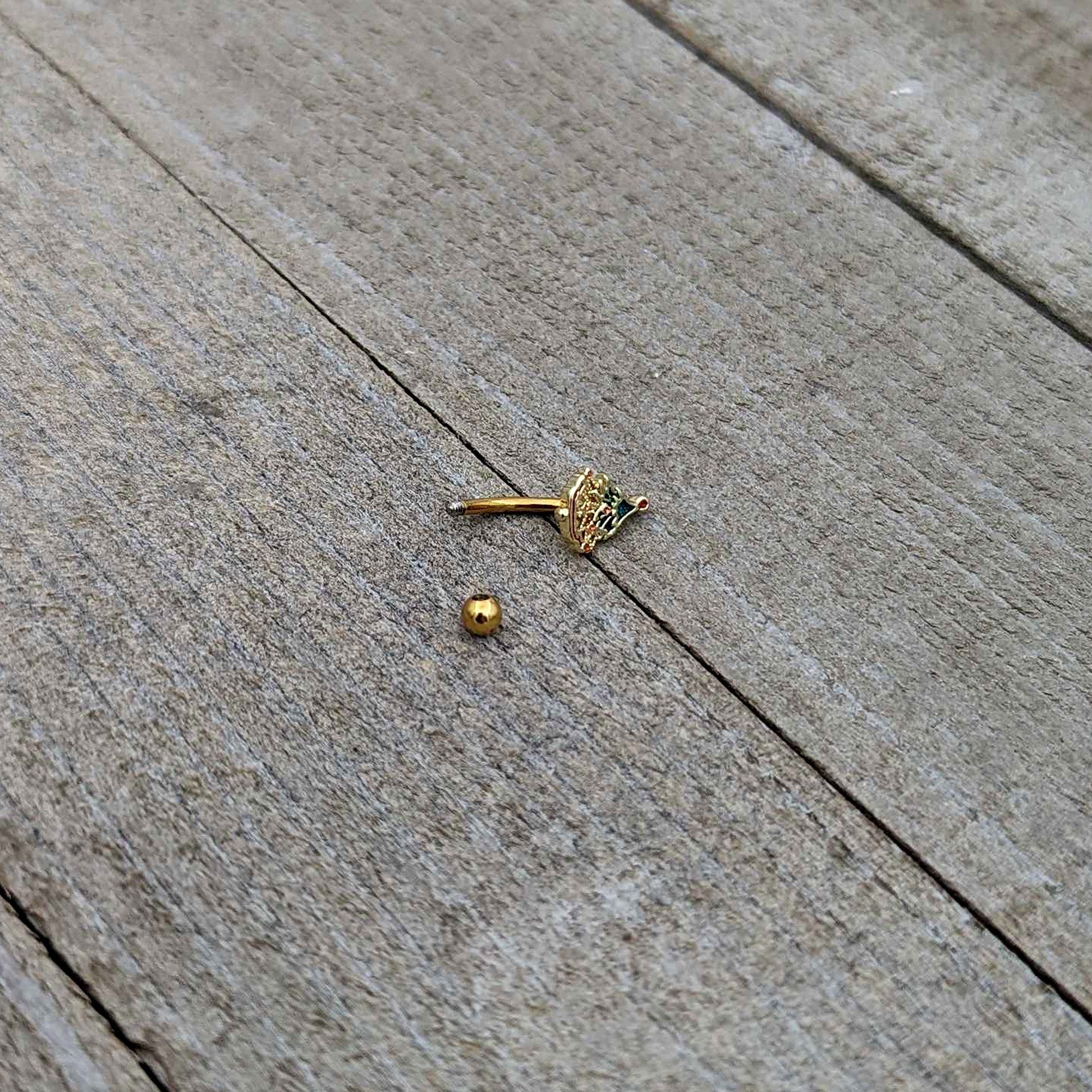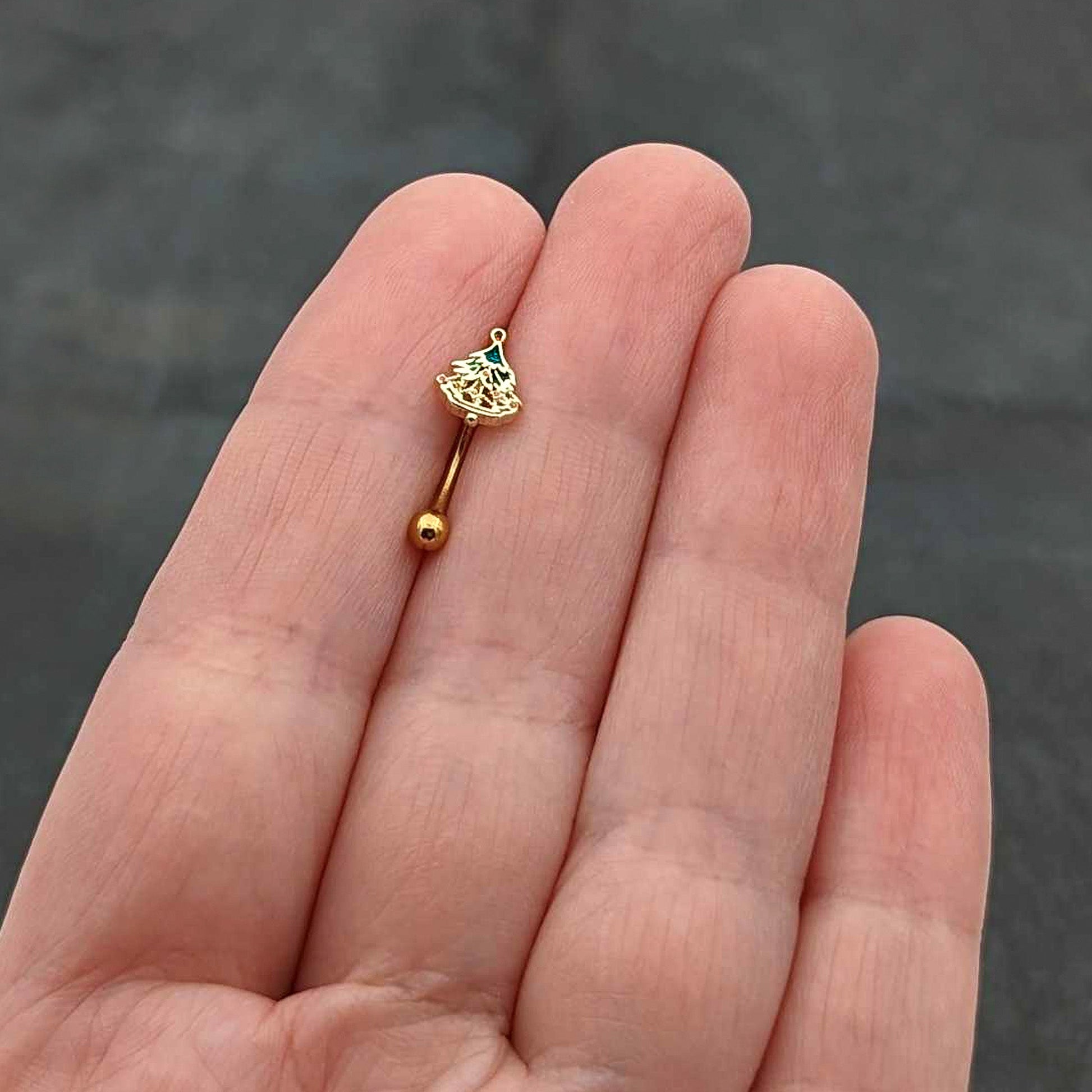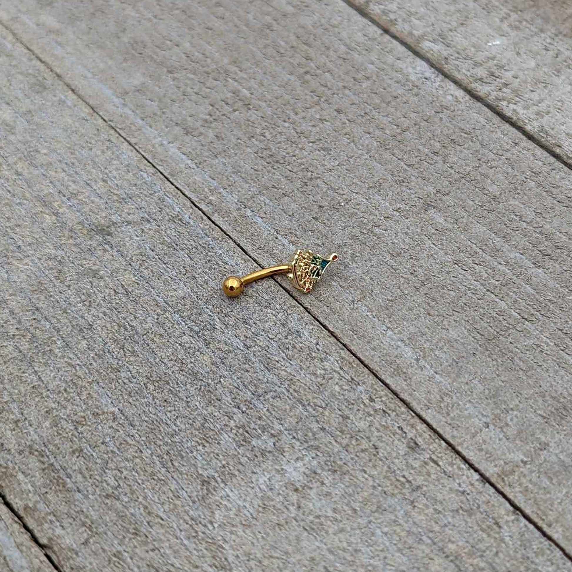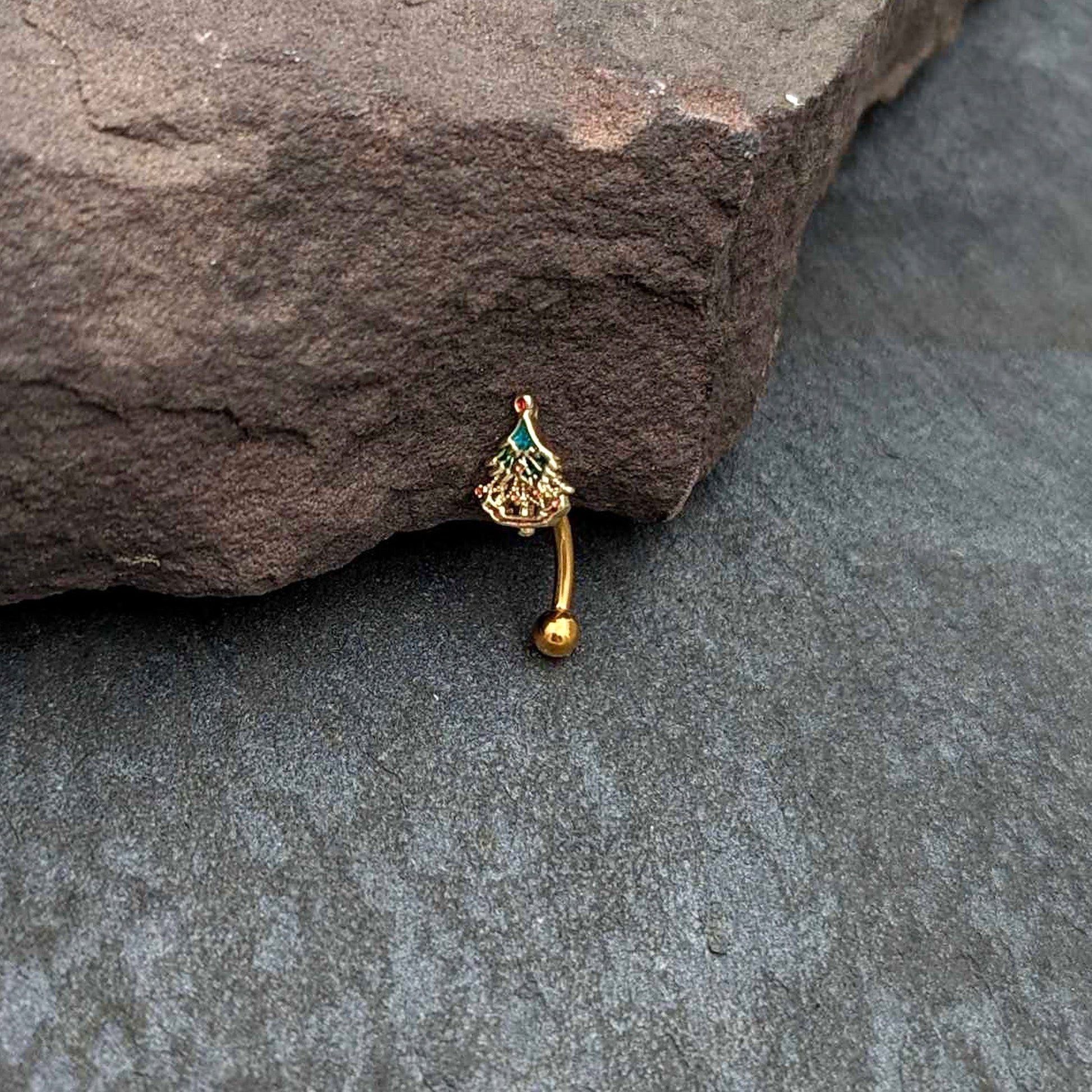Deck your piercings with this 16 gauge eyebrow jewelry! It's made with an 8mm gold tone PVD over 316L surgical grade stainless steel curved barbell with a 3mm bottom ball end. The top end features a festive Christmas tree, with green and blue inlay. It's further embellished with red gem orbs and a red gem inlaid star on top. You can rock this tree around multiple piercings including tragus, eyebrow, and some rook piercings. You'll be feeling fabulous and festive when you're rocking this Christmas cartilage jewelry around!