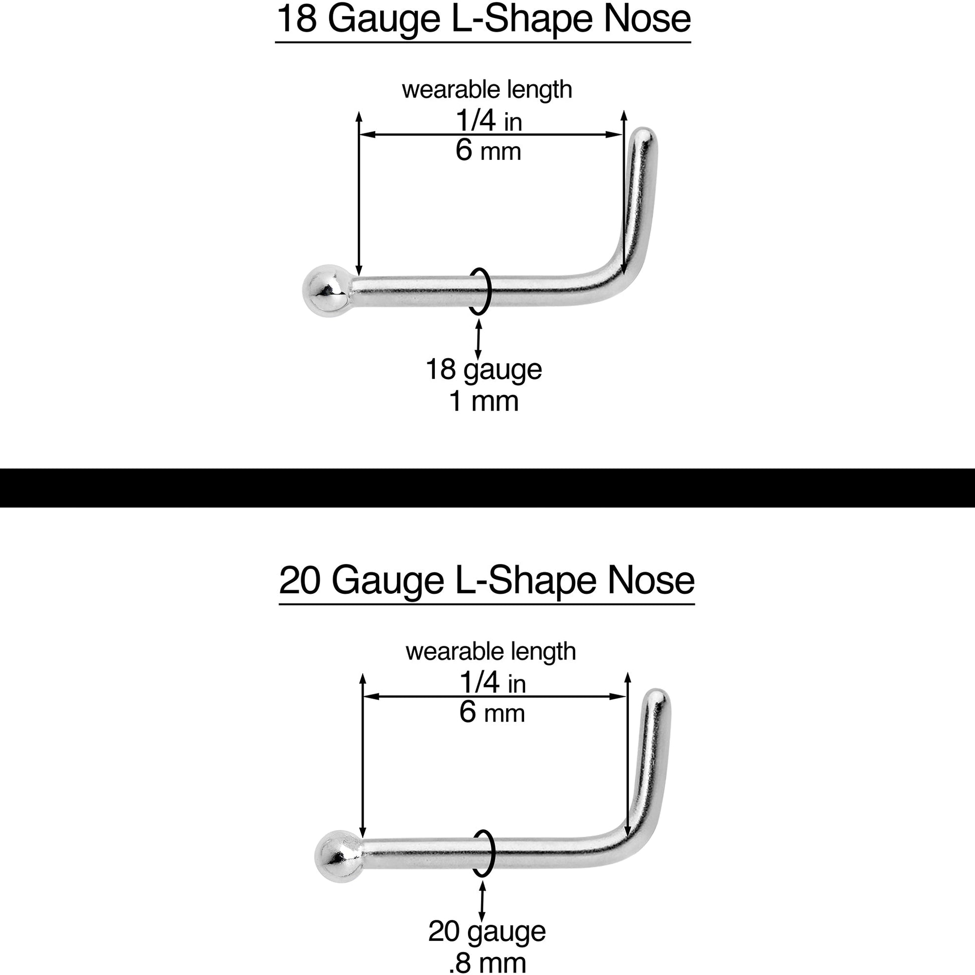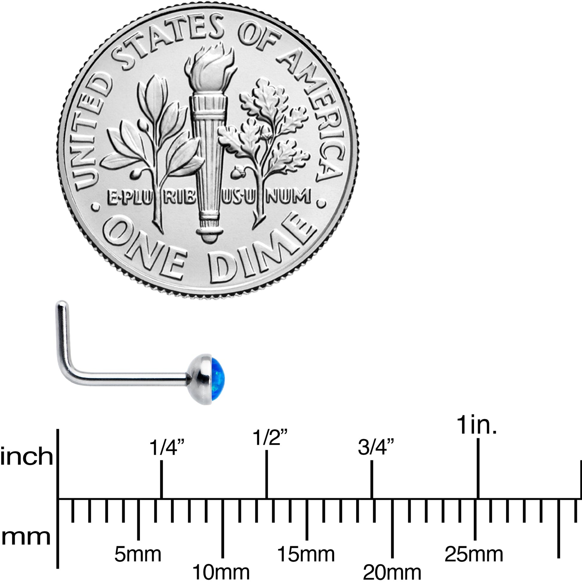 Bring mystical beauty to your nose piercing with this L-shaped nose ring featuring a 2mm blue synthetic opal. This 20 gauge nose ring measures 1/4" at the bend of its shape and the post is made of 316L surgical grade stainless steel.