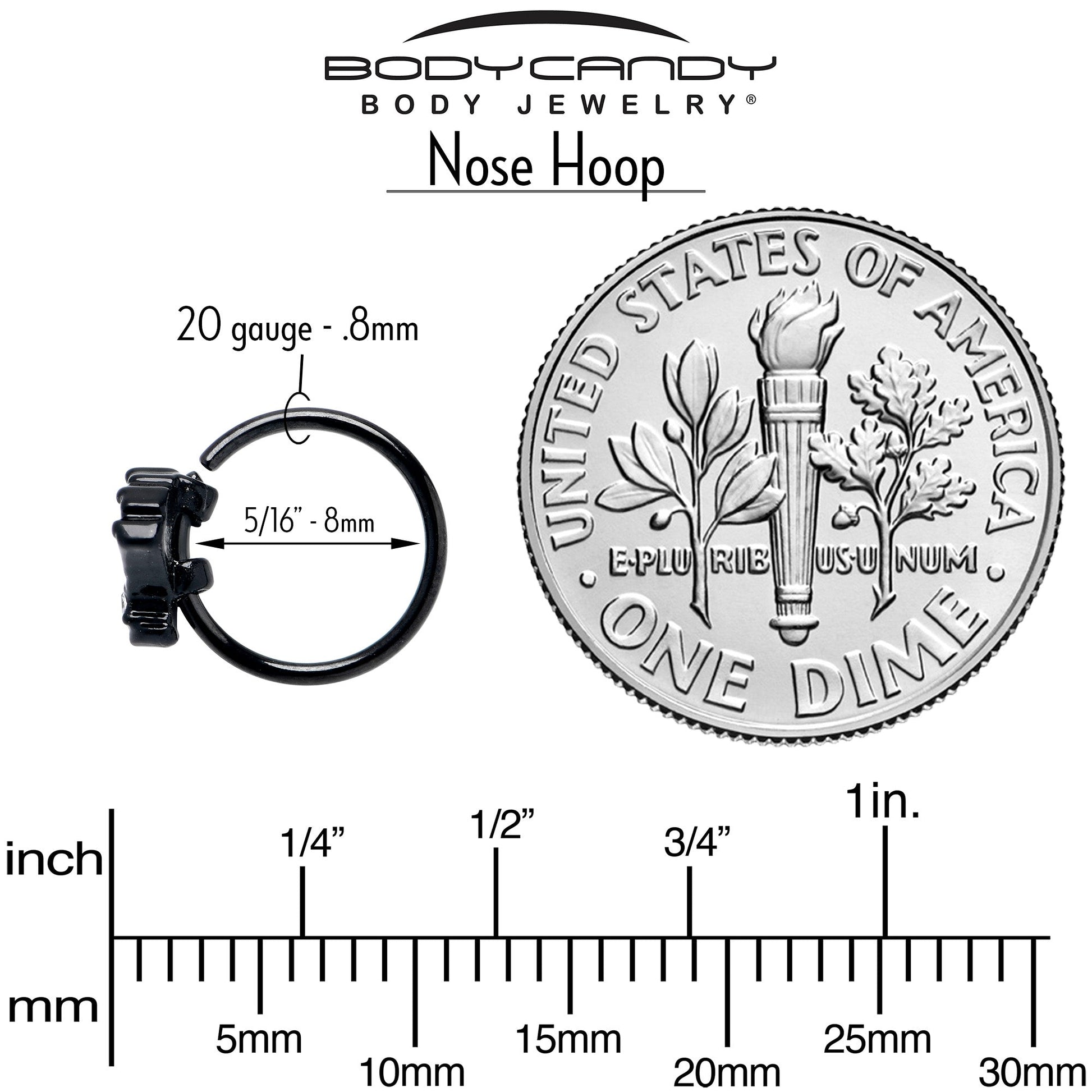 20 Gauge (.8mm), 5/16" (8mm), Black PVD over 316L Surgical Grade Stainless Steel Circular Ring, Cubic Zirconia
