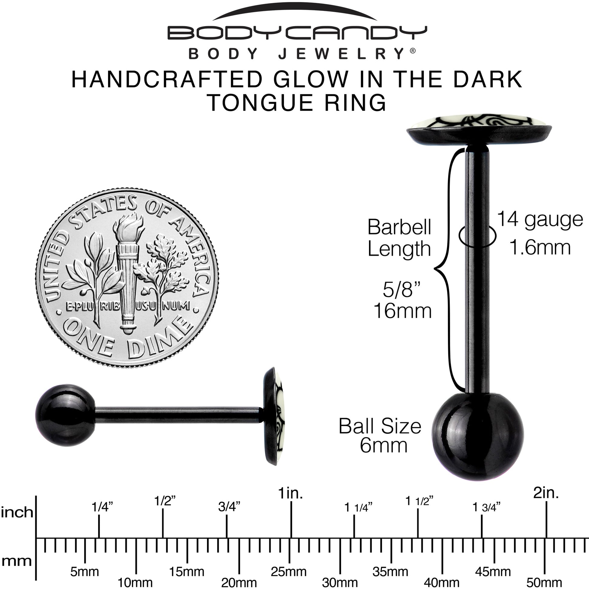 Get your glow on and look like the cat's pajamas with this 14 gauge tongue jewelry. It's made made with a 5/8 inch black anodized titanium over 316L surgical grade stainless steel straight barbell with a 6mm bottom ball end. The top end features a cat charm. The cat features simple black detailing for visual impact and when you turn down the lights, it glows in the dark. You'll be positively glowing with this classic kitty cat tongue piercing jewelry.