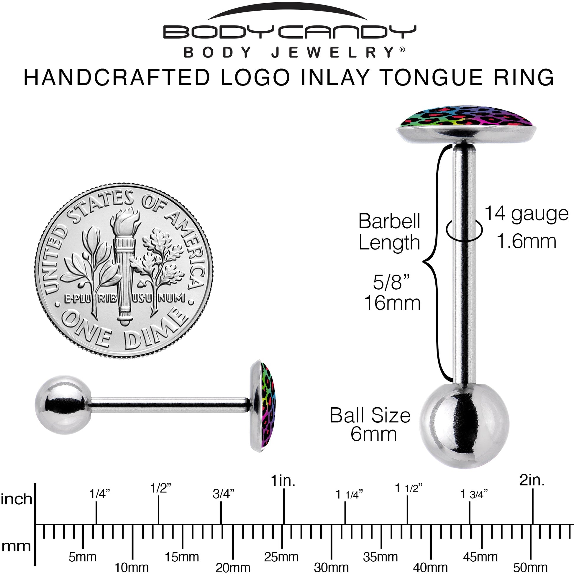 Get a little wild with this colorful 14 gauge cheetah print tongue jewelry. This cheetah animal print tongue ring is made with a 5/8 inch hypoallergenic 316L surgical grade stainless steel straight barbell with a 6mm bottom ball end. The top charm features a vibrant rainbow color to showcase your wildly colorful side. This hypoallergenic 316L surgical grade stainless steel tongue ring body jewelry is perfect for anyone with sensitive skin. This eye-catching piece showcases a unique artist-drawn logo insert that will have you ready to roar.