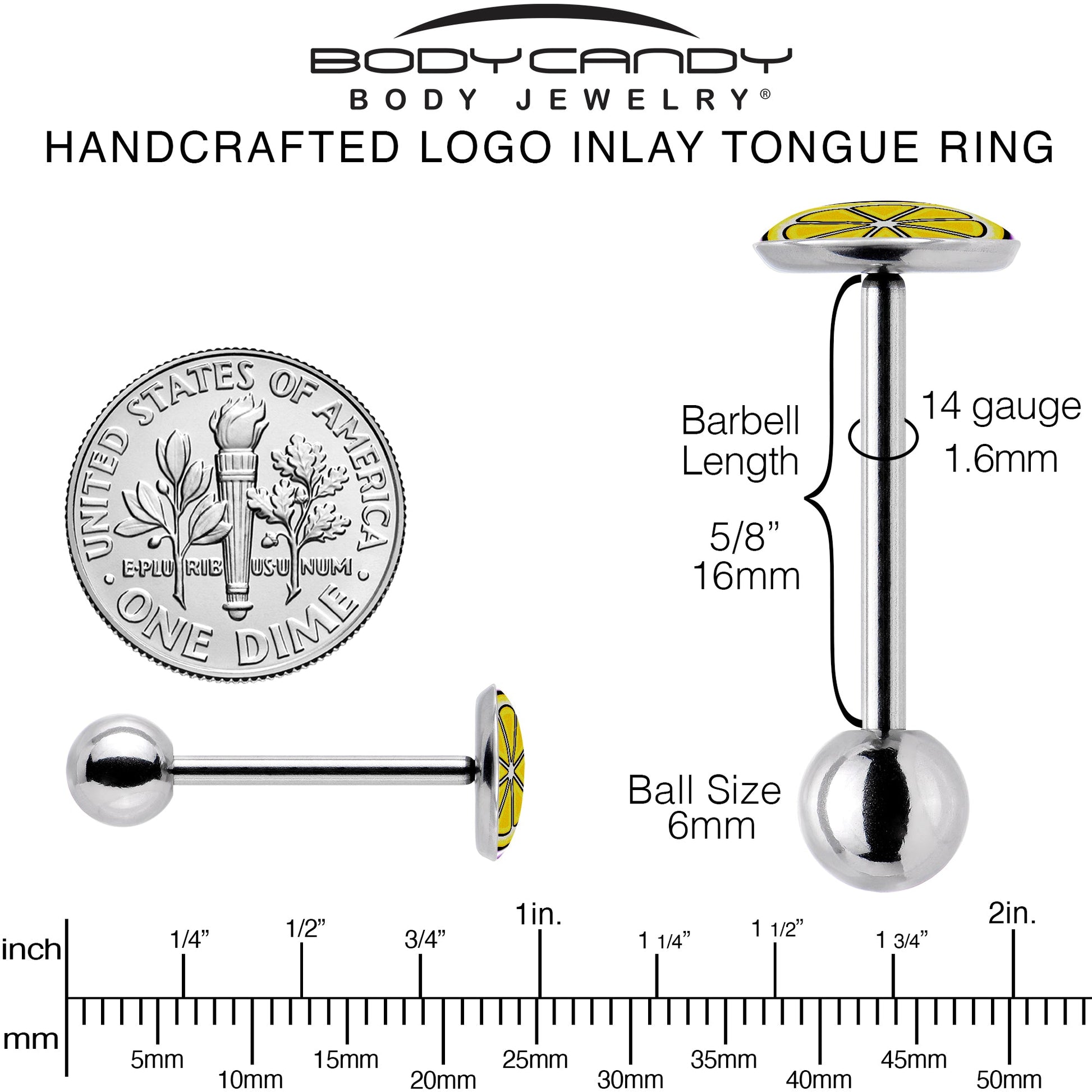 If life hands you lemons, make something fabulous like this 14 gauge tongue jewelry. It is made with a 5/8 inch 316L surgical grade stainless steel straight barbell with a 6mm bottom ball end. The top end features a luscious yellow lemon slice charm on a teal background for color contrast you cannot ignore. You cannot help but taste the sweet life with this colorful citrus fruit tongue piercing ring.
