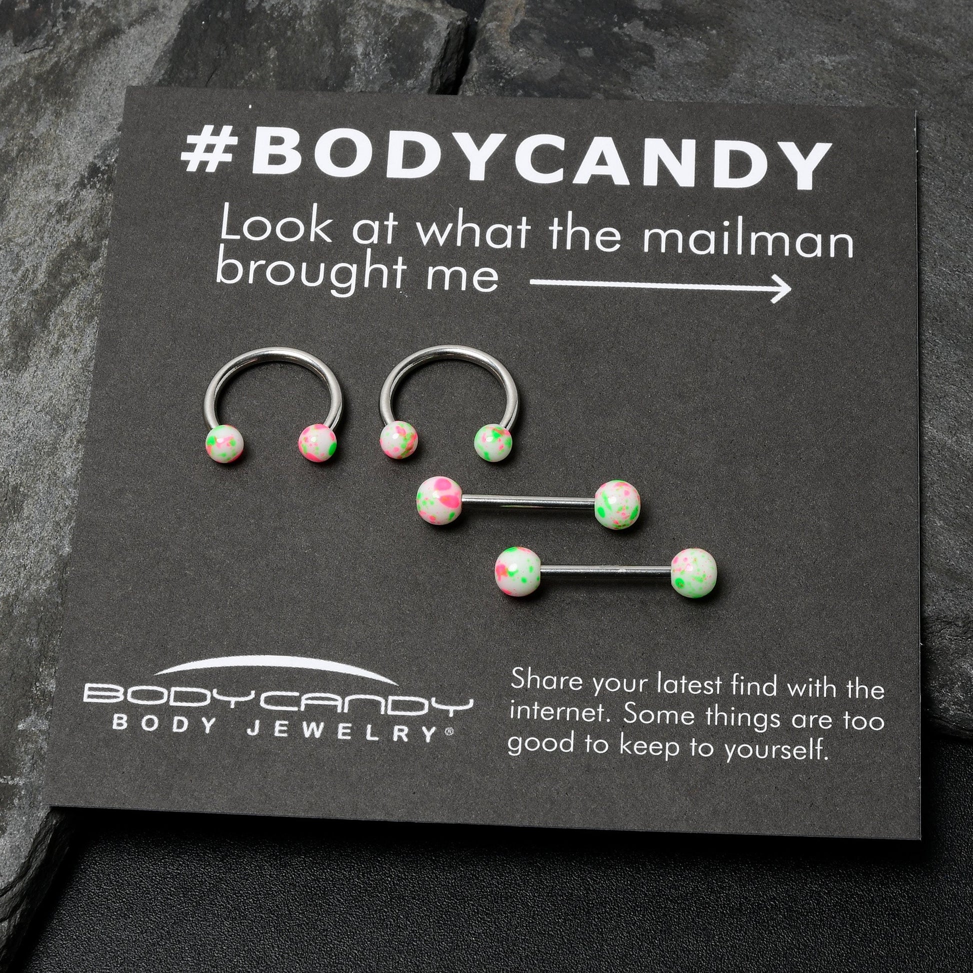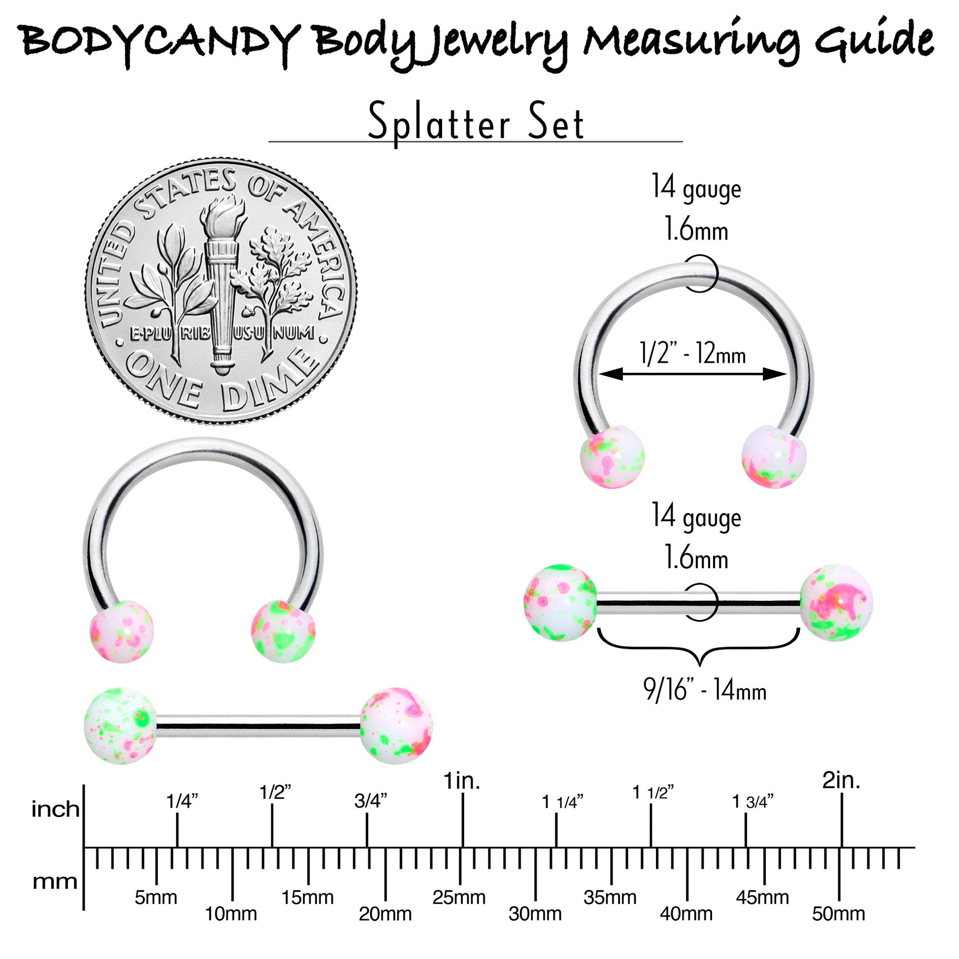 This 14 gauge nipple jewelry will keep you covered when you really like your piercings to match. You get one pair of 14mm durable 316L surgical grade stainless steel straight barbells. The ball ends are white acrylic with a green and pink splatter pattern. You also get one pair of 12mm durable 316L surgical grade stainless steel circular barbells with matching splatter pattern ball ends. You can even rock them in some larger gauge piercings including helix, daith, and some conch piercings. Whether you mix or match, keep it colorful. Sold as a set of four.