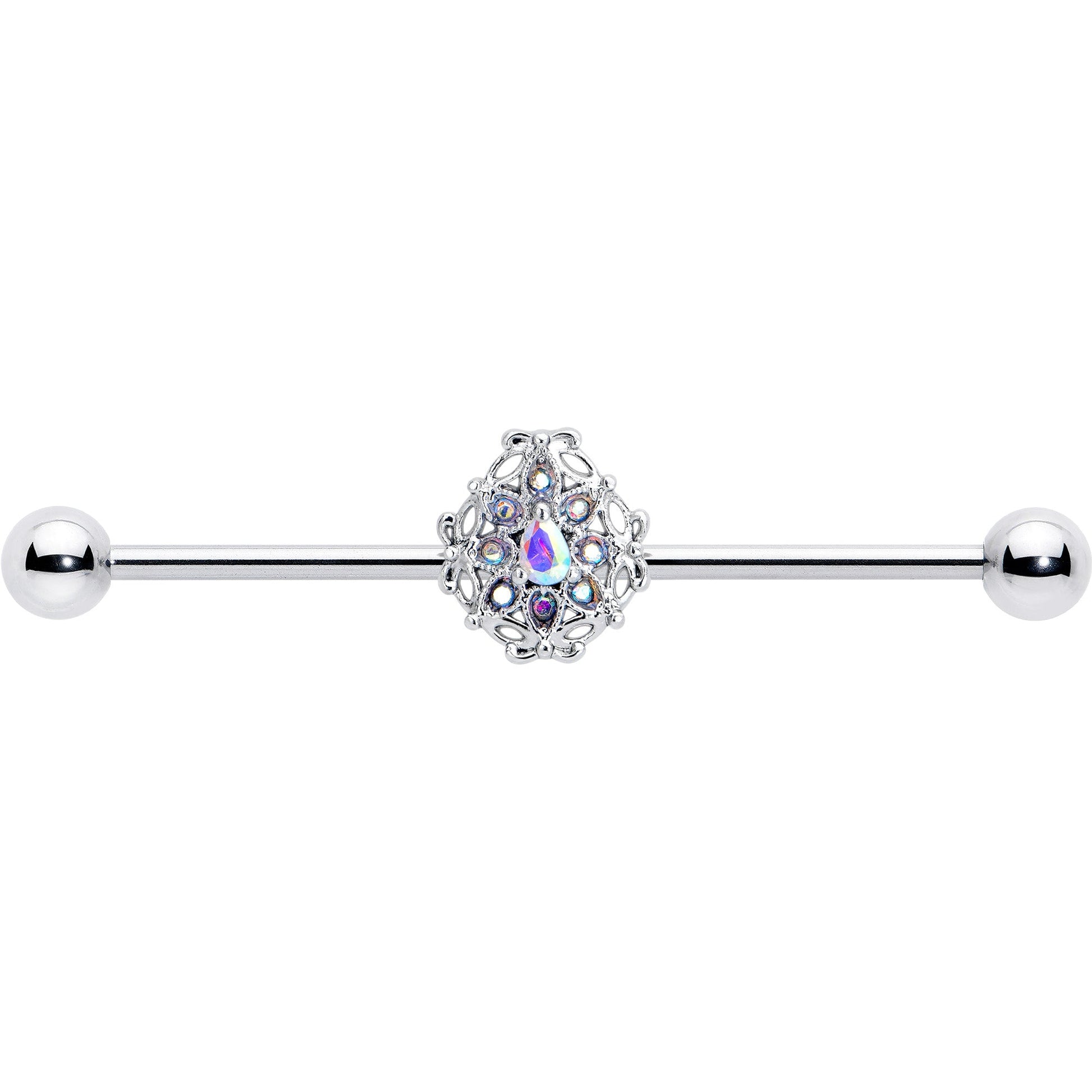 You may need to shield your eyes from the fierce glamour radiating from this 14 gauge helix barbell. It's made with a 1 1/2 inch 316L surgical grade stainless steel straight barbell with 5mm ball ends. It features an art-deco inspired cluster of small aurora gems around a large drop shaped aurora gem. The look is both simple and strikingly dramatic, and you can slide it up and down the length of the barbell for the perfect look. Take glamour to a whole new level with this alluringly opulent barbell earring.