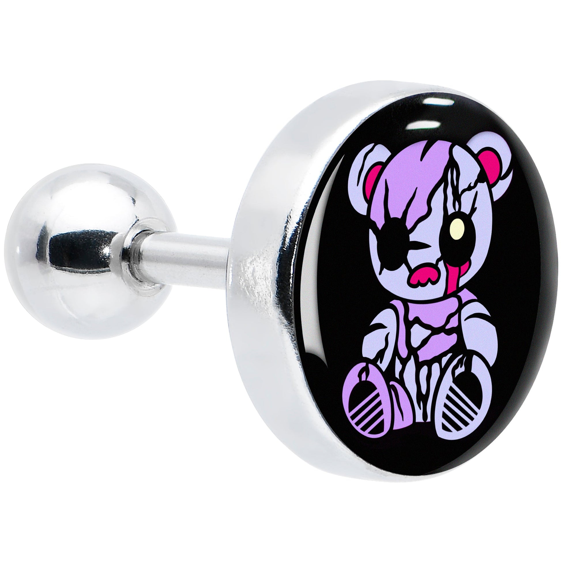 This teddy bear is cuddly cute with an edge on this 16 gauge tragus stud. It's made with a 6mm durable 316L surgical grade stainless steel straight barbell with a 4mm ball end. It features a black disc charm with a purple teddy bear. The teddy bear is scarred and missing an eye for a look that full of edgy attitude you can't help but want to cuddle. You can even rock it in multiple piercings including tragus, helix, and some conch piercings. Give your look a stylish snuggle with this punk teddy bear cartilage piercing jewelry.