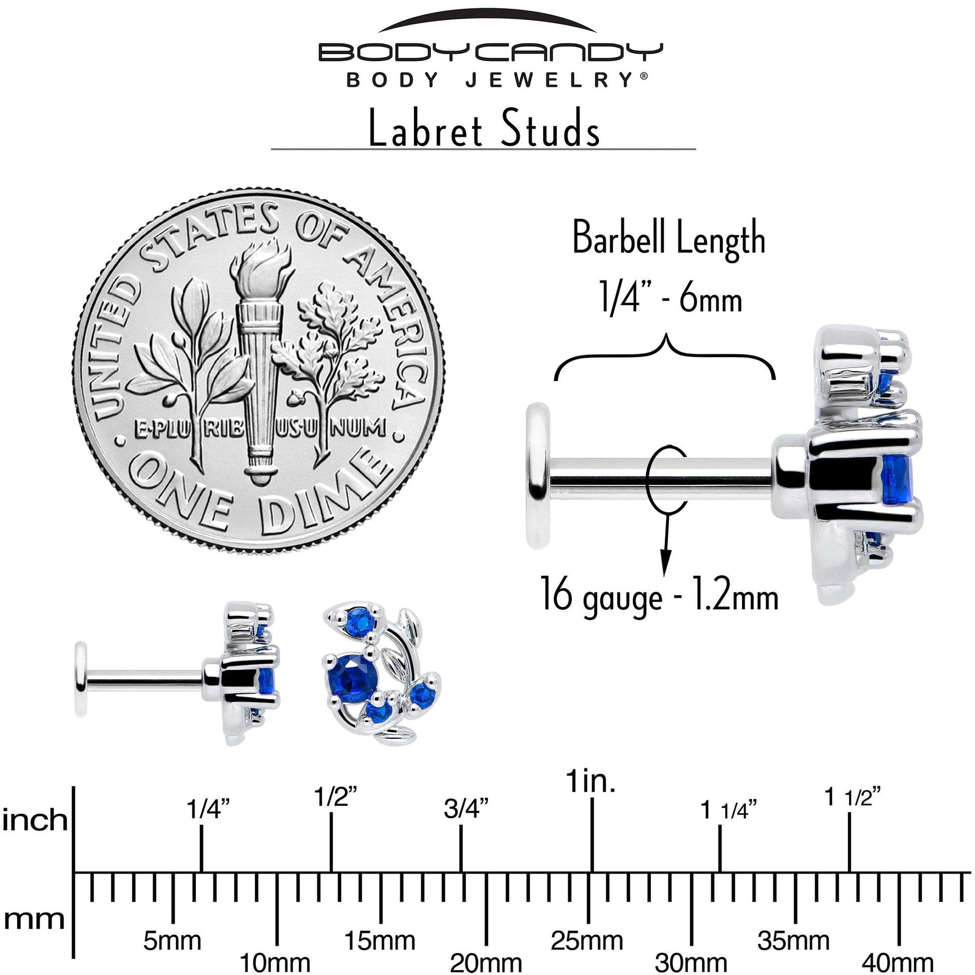 You'll be looking fine when you're rocking the vine on this 16 gauge lip ring. It's made with a 6mm durable 316L surgical grade stainless steel straight post with a flat disc back. It features a leafy vine charm, with the leaves set with deep blue gems for a gorgeous color contrast. It's further embellished with unadorned leaves for added visual impact and you can rock it in multiple piercings including tragus, helix, and some conch piercings. This cartilage piercing jewelry is sure to grow on you.Specifications