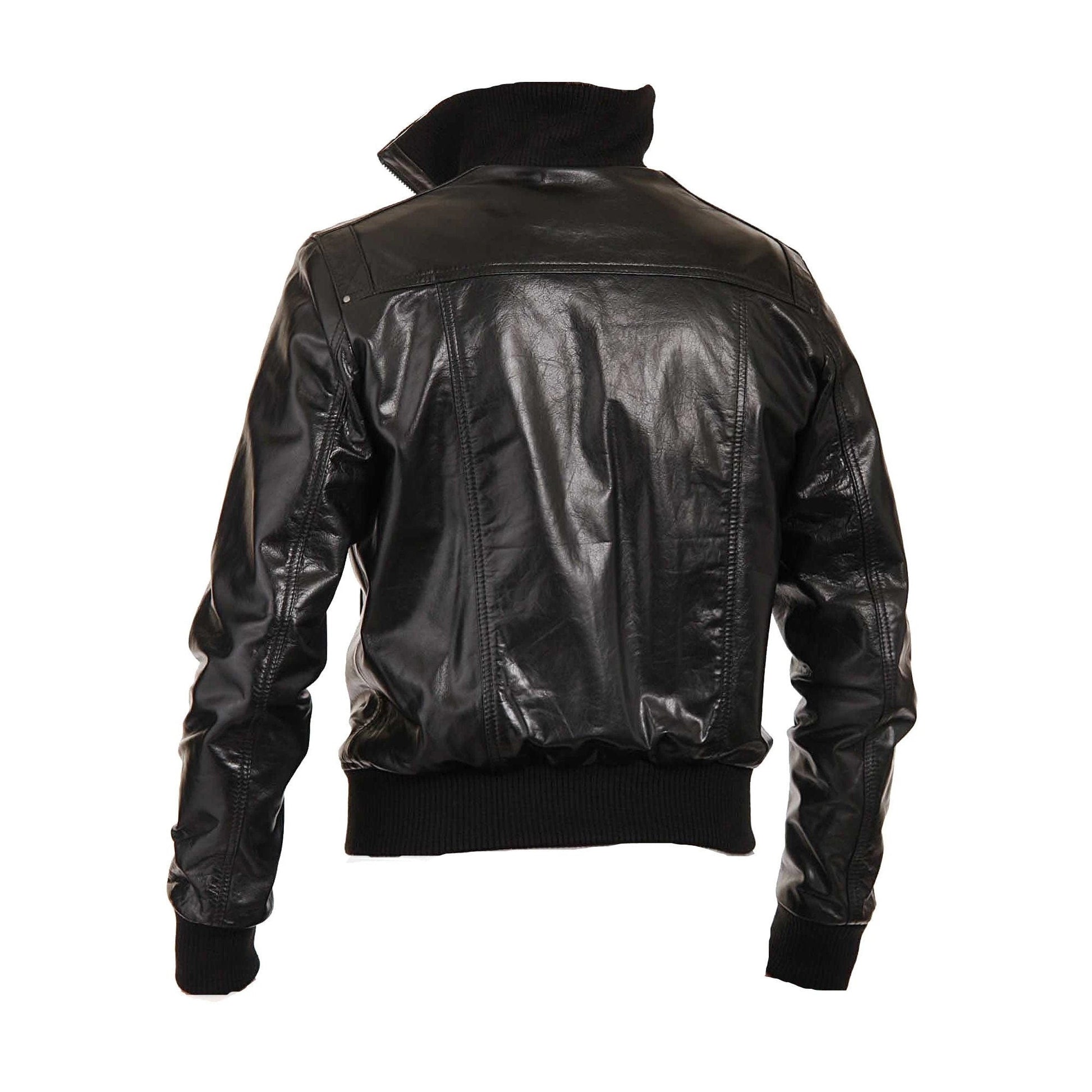 Handmade Black Leather Jacket With Straight Ribbed Collar