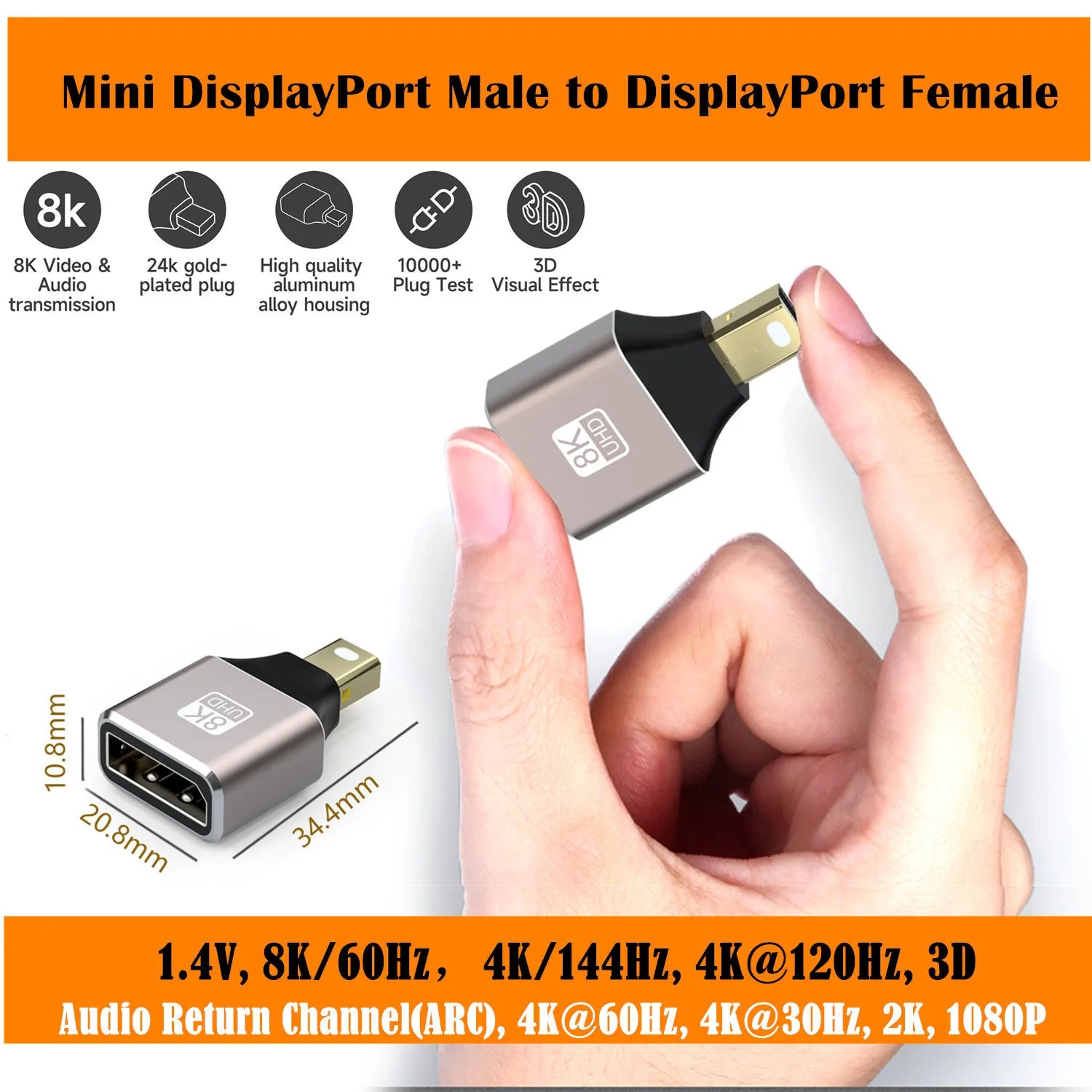 Mini DisplayPort to DisplayPort Adapter 8K60Hz DP2.1 Female to MiniDP Male Bi-Directional Connector for Laptop PC Gaming Monitor