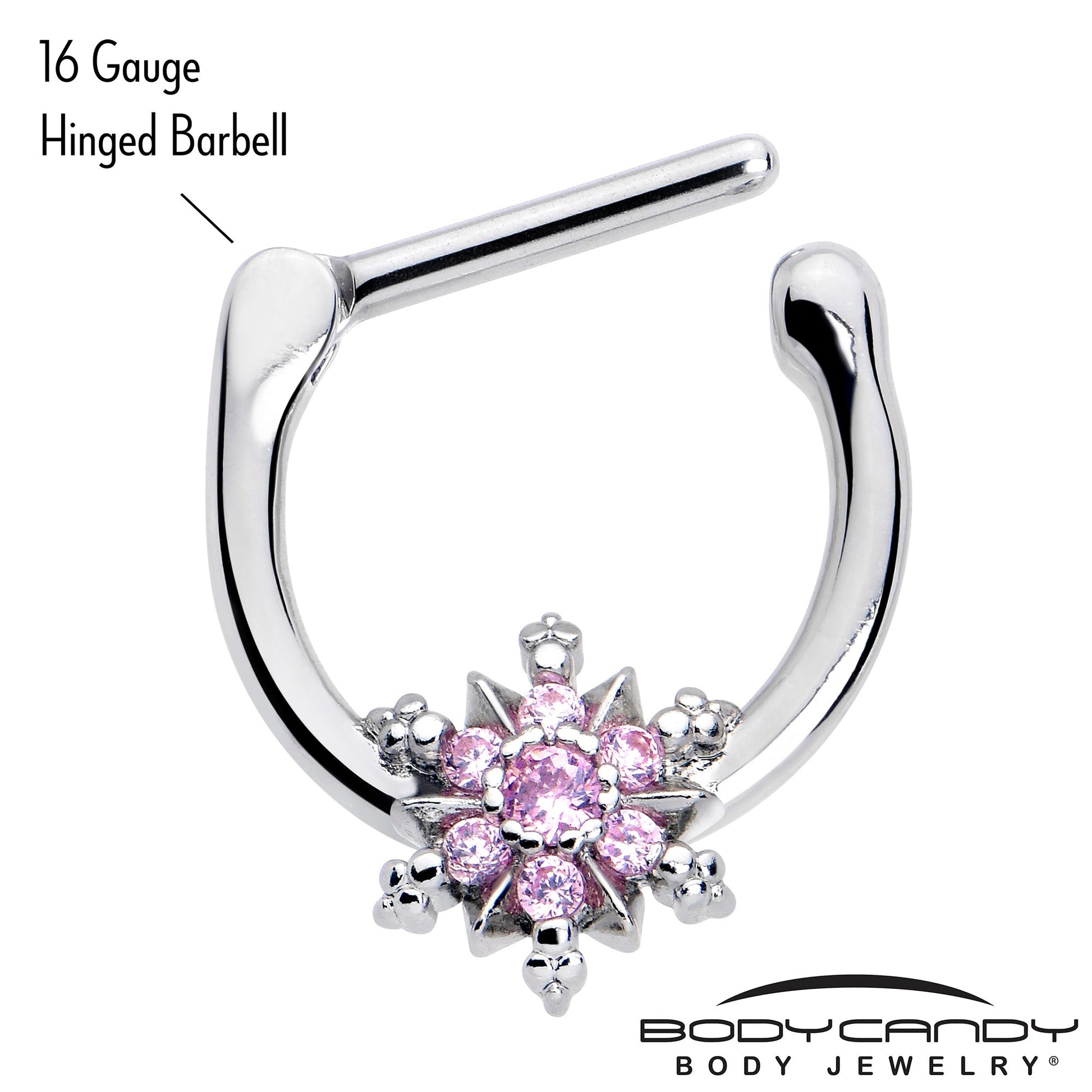 This winter, get fashionable and funky with the glamorous snowflake on this 16 gauge septum ring. It's made with an 8mm durable 316L surgical grade stainless steel hinged straight barbell. It features a heavily ornamented snowflake charm, with pink cubic zirconia gem embellishments and textured detailing. It also features a hinged, clicker design that makes insertion and removal a snap and you can even rock it in multiple piercings including tragus, helix, and some conch piercings. You'll have glamour to spare all winter long with this stylish snowflake cartilage piercing jewelry.Specifications