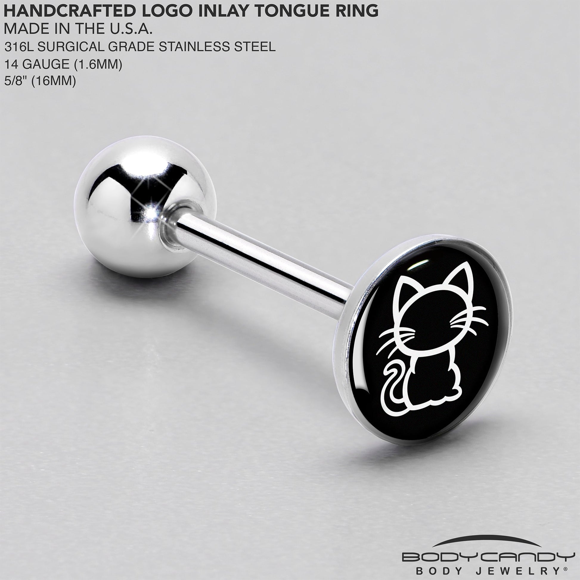 Keep it simple while keeping it as adorable as the kitty cat on this 14 gauge tongue jewelry. It's made with a 5/8 inch 316L surgical grade stainless steel straight barbell with a 6mm bottom ball end. The top end features a cat charm. The cat is styled with the simplest of detailing in white against a black background for visual impact. You'll be ready to purr like a pussycat with this fabulous feline tongue piercing ring.
