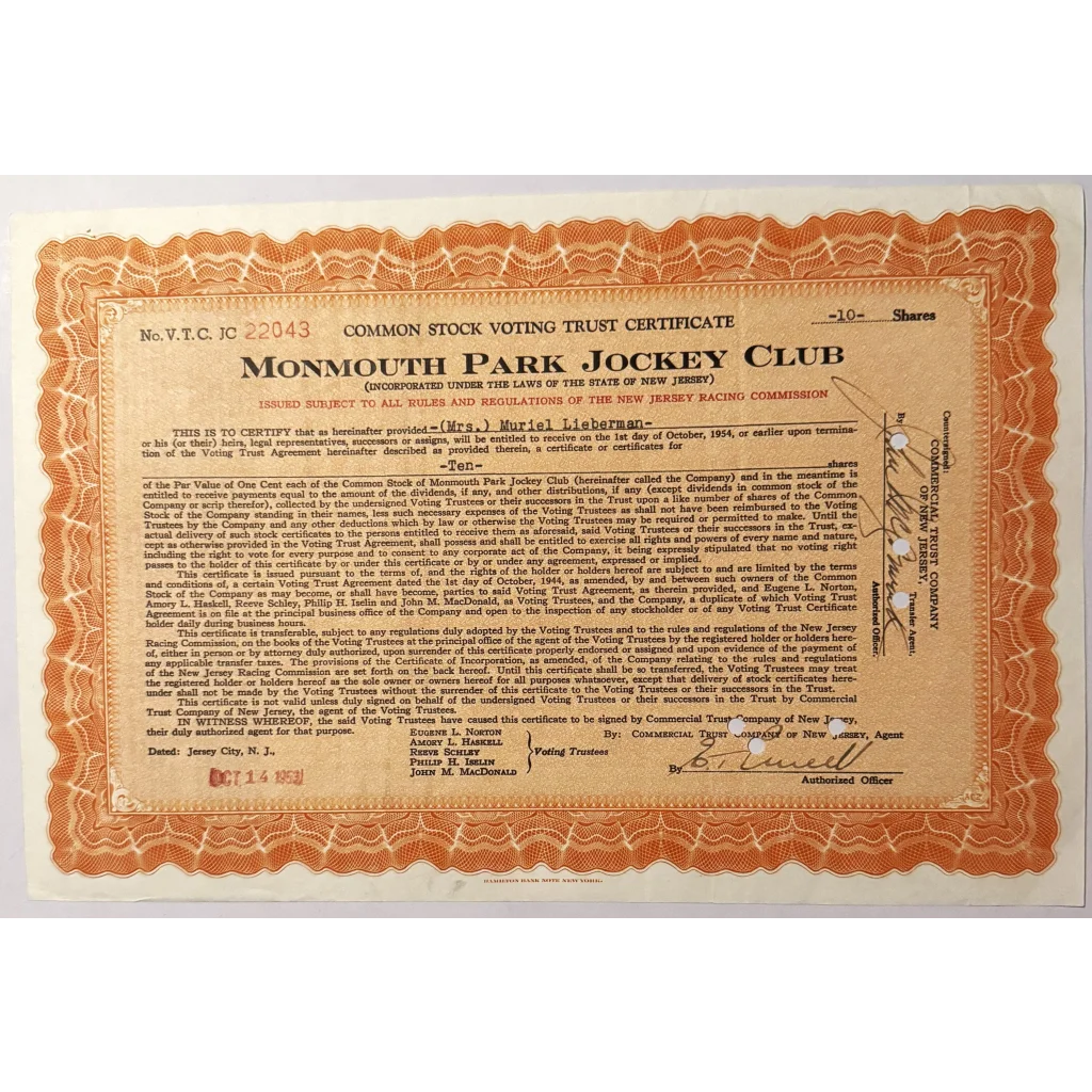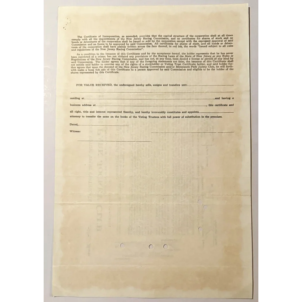Immerse yourself in the thrilling world of horse racing history with this extraordinary 1940s - 1950s Monmouth Jockey Club Stock Certificate! This captivating piece of memorabilia offers a unique glimpse into the prestigious legacy of Monmouth Park, a cornerstone of American thoroughbred racing since 1870!