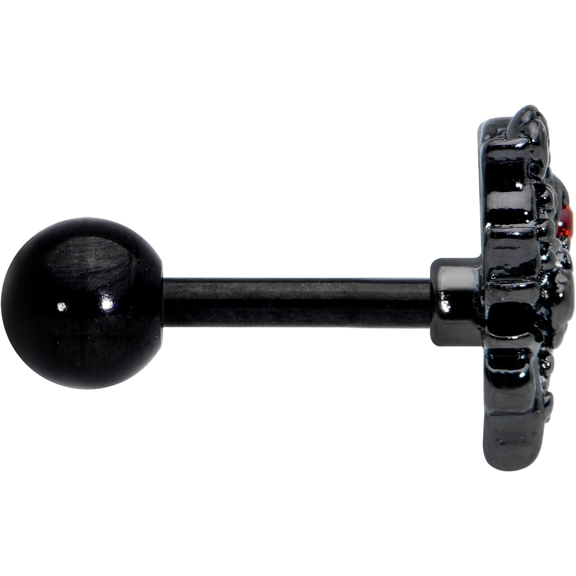 Let the love blossom when you are rocking this 16 gauge tragus stud. It is made with a 6mm black PVD over 316L surgical grade stainless steel straight barbell with a 4mm ball end. It features a heart charm, embellished with clear cubic zirconia gems. It also features a pair of flowers with red cubic zirconia gem centers and twining vines. You can even rock it in multiple piercings including tragus, helix, and some conch piercings. Give your piercings some new goth glamour with this floral heart cartilage piercing jewelry.