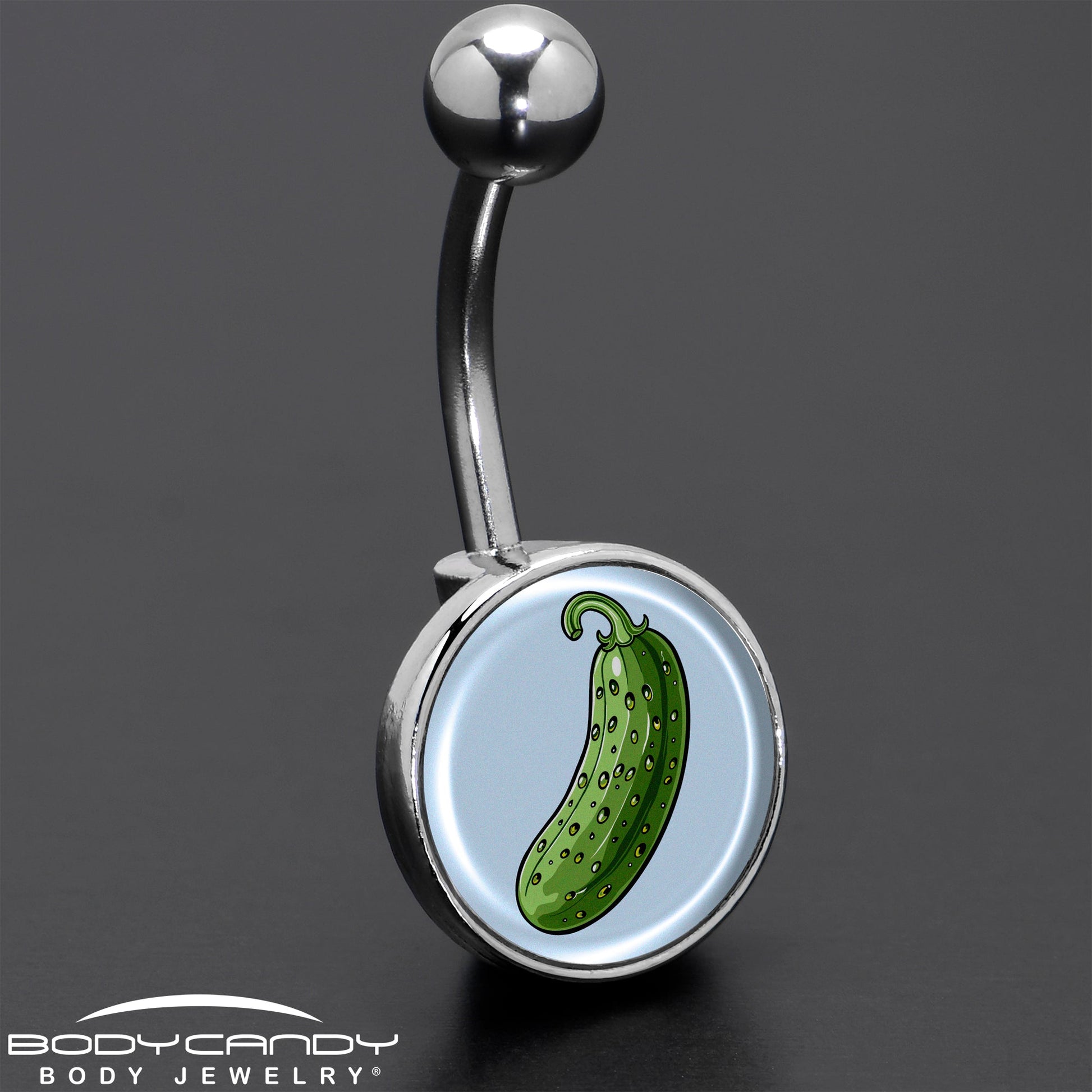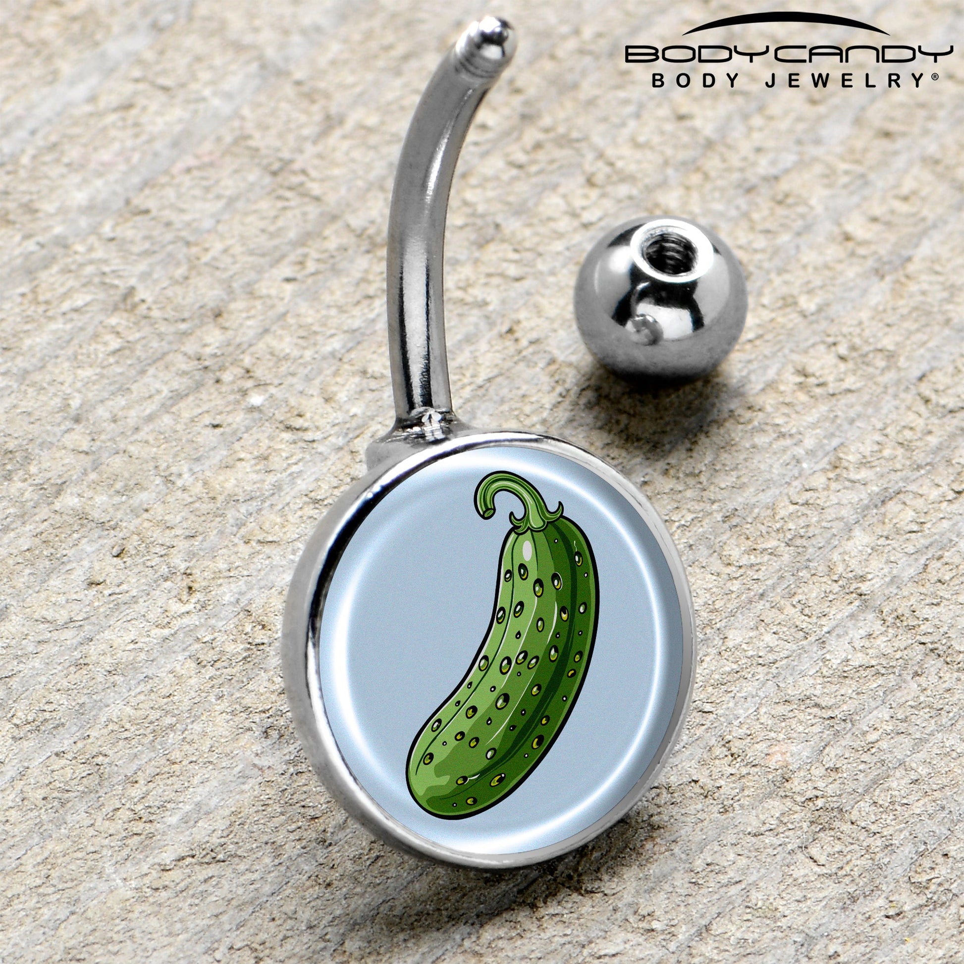 This Pickle belly button ring is a Big Dill. Artist-drawn logo inlay design for any Pickle Lover; this pickle jewelry is sure to turn heads wherever you go. Made from premium 316L surgical grade stainless steel, this logo belly ring boasts durability, resistance to corrosion, and a comfortable fit with its 14 Gauge (1.6mm) thickness and 7/16" (11mm) length.