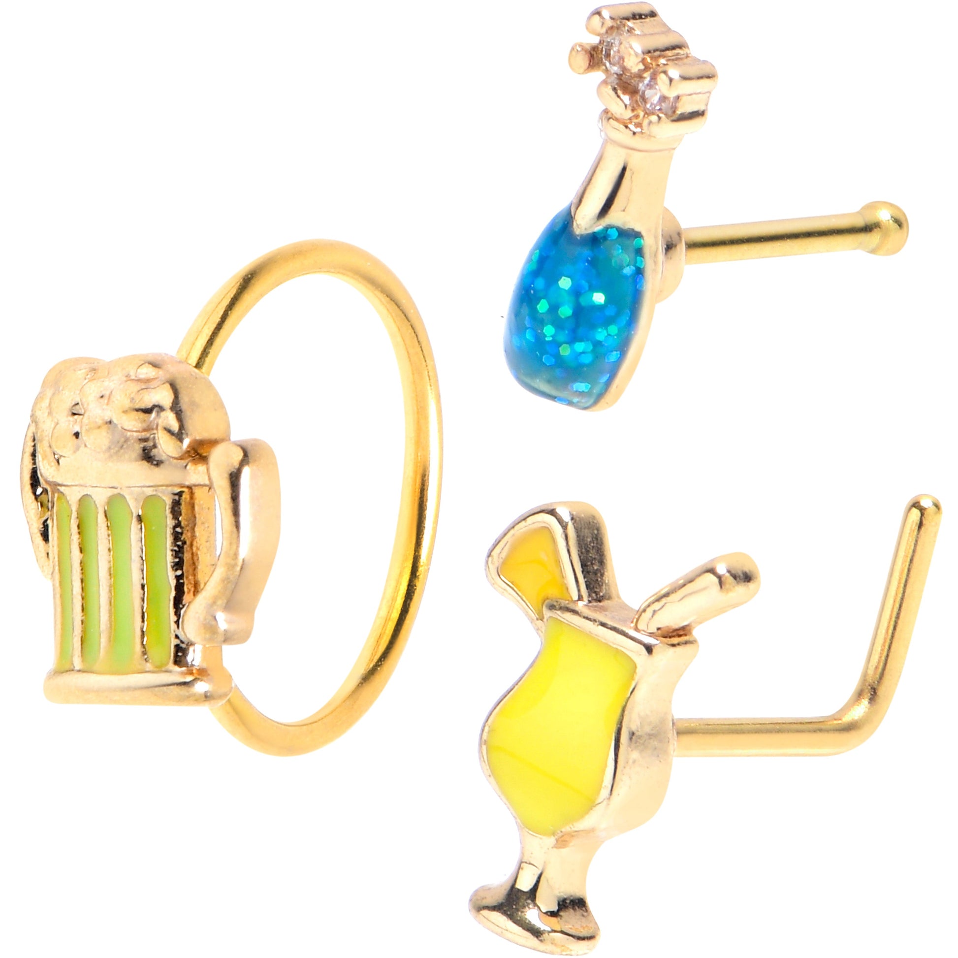 Bottoms up and party down in style with this set of 20 gauge nostril rings. You get one with a 6mm gold tone PVD over 316L surgical grade stainless steel straight post that features a bottle of champagne with blue glitter inlay embellishment. The second is made with an 8mm gold tone PVD over 316L surgical grade stainless steel circular ring and features a mug of beer embellished in green. The third one is made with a 7mm length at the bend gold tone PVD over 316L surgical grade stainless steel L-shaped post and features a tropical drink embellished with yellow inlay. Every hour will be happy hour when you're rocking this drink-themed nose piercing jewelry. Sold as a set of three.