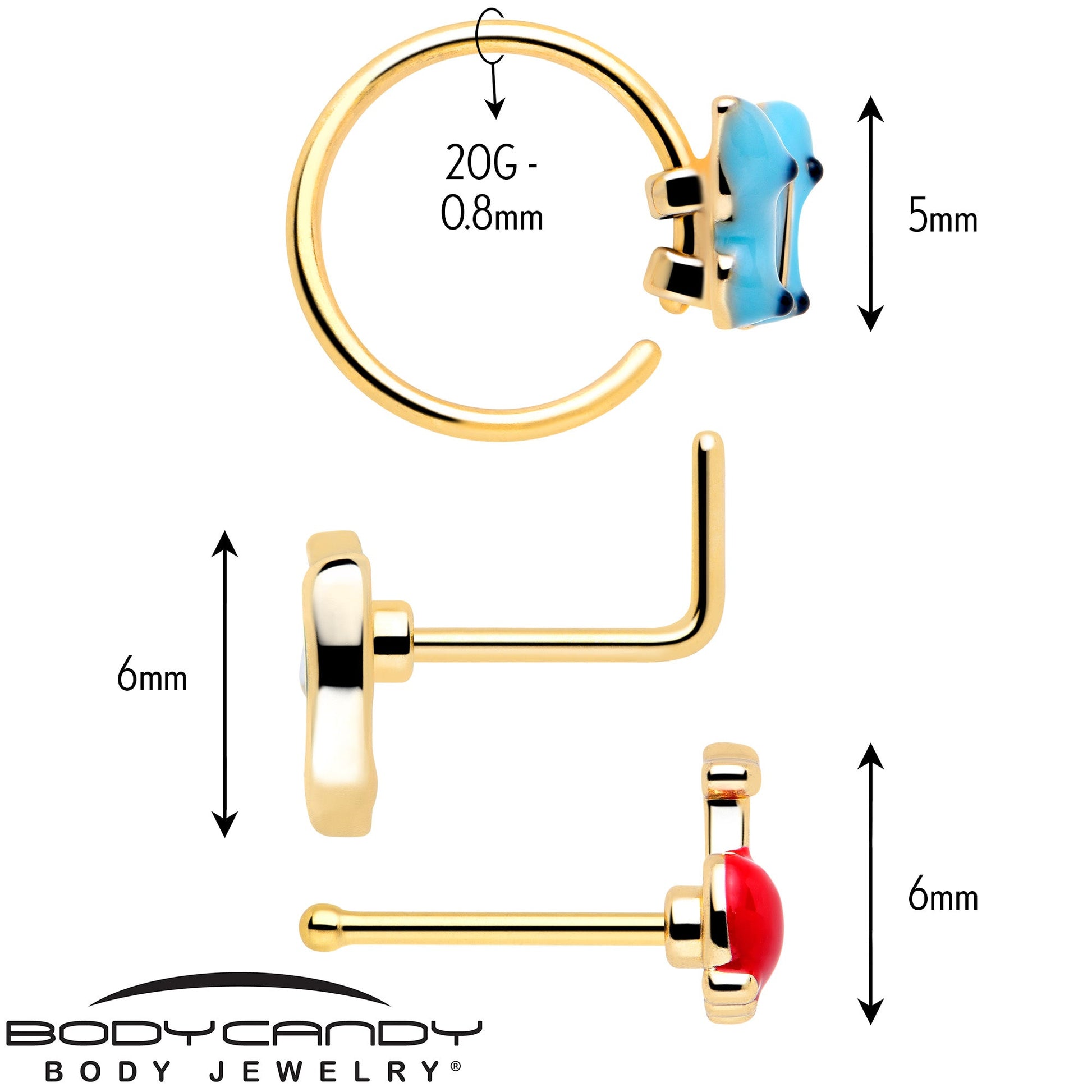 Put a little Spring in your piercings with this set of 20 gauge nostril rings. One is made with 6mm gold tone PVD over 316L surgical grade stainless steel straight post and features a delicious looking red cherries charm. The second one is made with a 7mm length at the bend gold tone PVD over 316L surgical grade stainless steel L-Shaped post and features a white flower charm with green leaf detailing. The third one is made with an 8mm gold tone PVD over 316L surgical grade stainless steel circular ring and features a blue butterfly charm embellished with dark blue polka dot embellishments. Make your nostril piercing feel like Springtime with this cheerful, colorful nose piercing jewelry. Sold as a set of three.