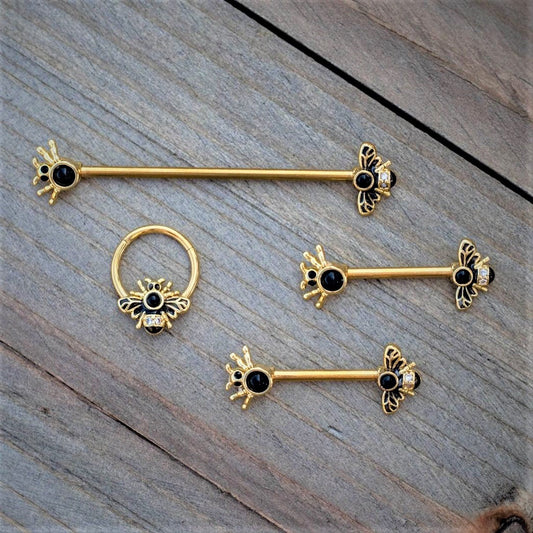 14G Clear Black Gem Gold Tone Bug Out Bee Insect Industrial Barbell 38mm