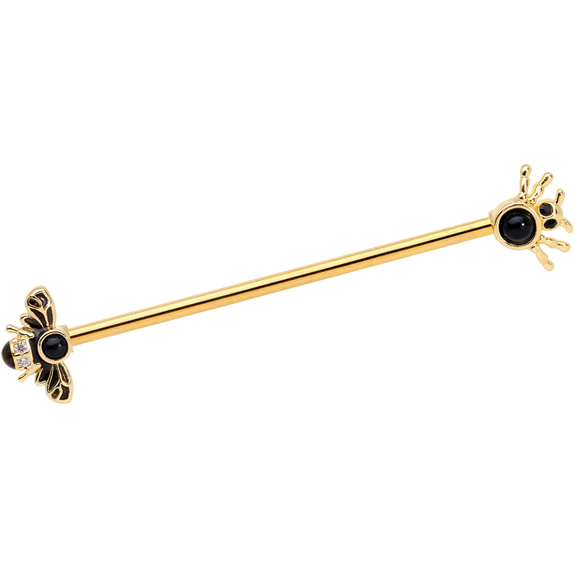 14G Clear Black Gem Gold Tone Bug Out Bee Insect Industrial Barbell 38mm