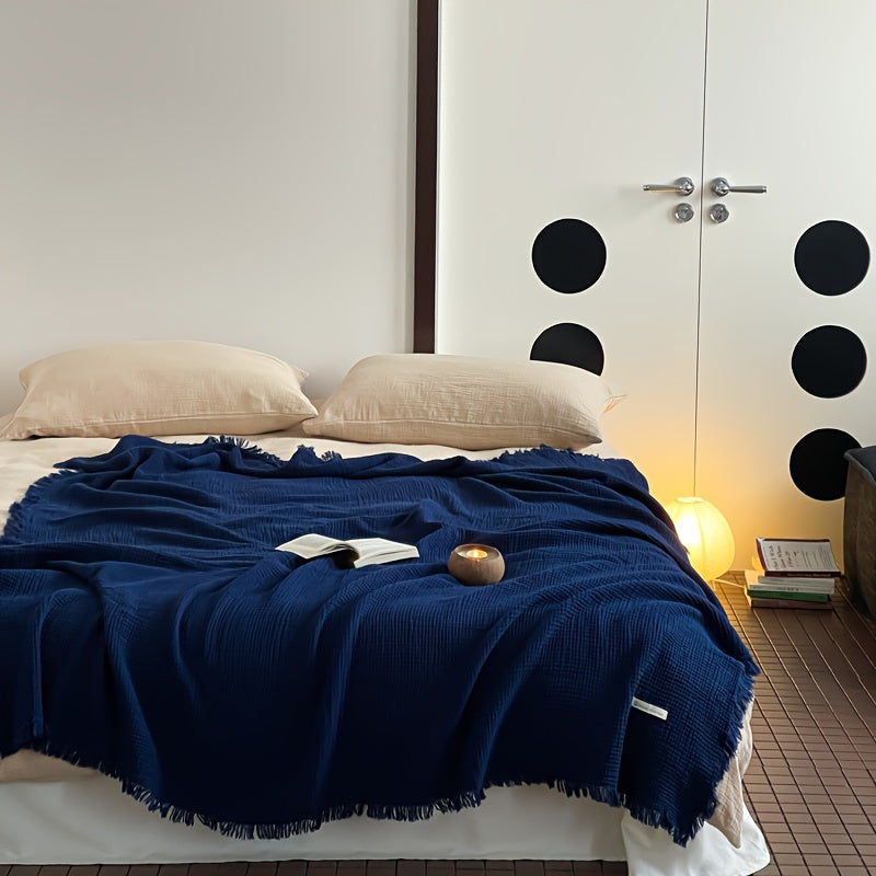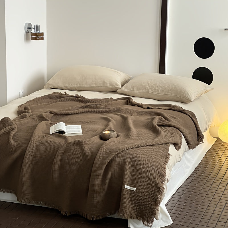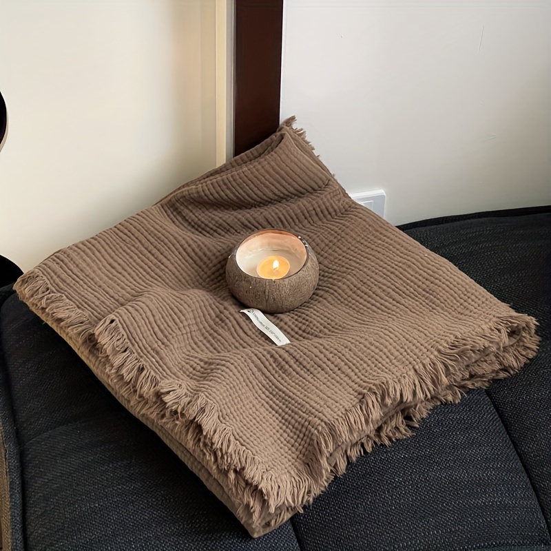 1pc Cotton Crinkle Tassel Blanket Solid Color Nap Blanket Leisure Travel Sofa Bed Blanket