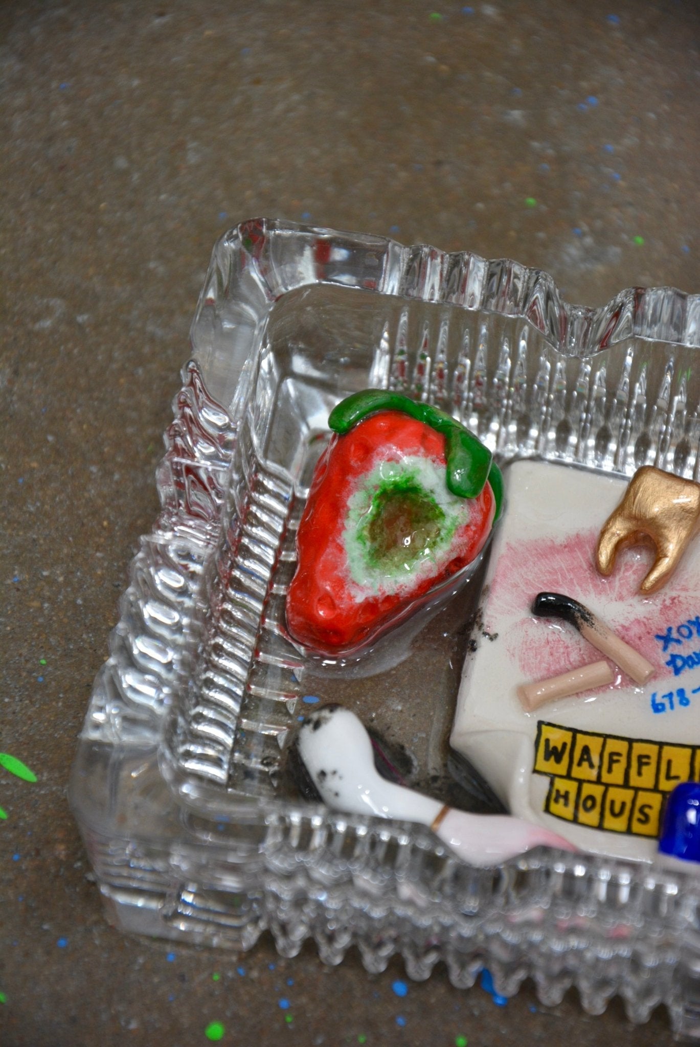 Oh Waffle House… a magical place where you can find just about anything in an ashtray! Featuring a cheeky love note from Darla on a torn order ticket, discarded moldy strawberry, gold tooth, broken burnt matchstick, cigarette butt with lipstick stain, and a pill.