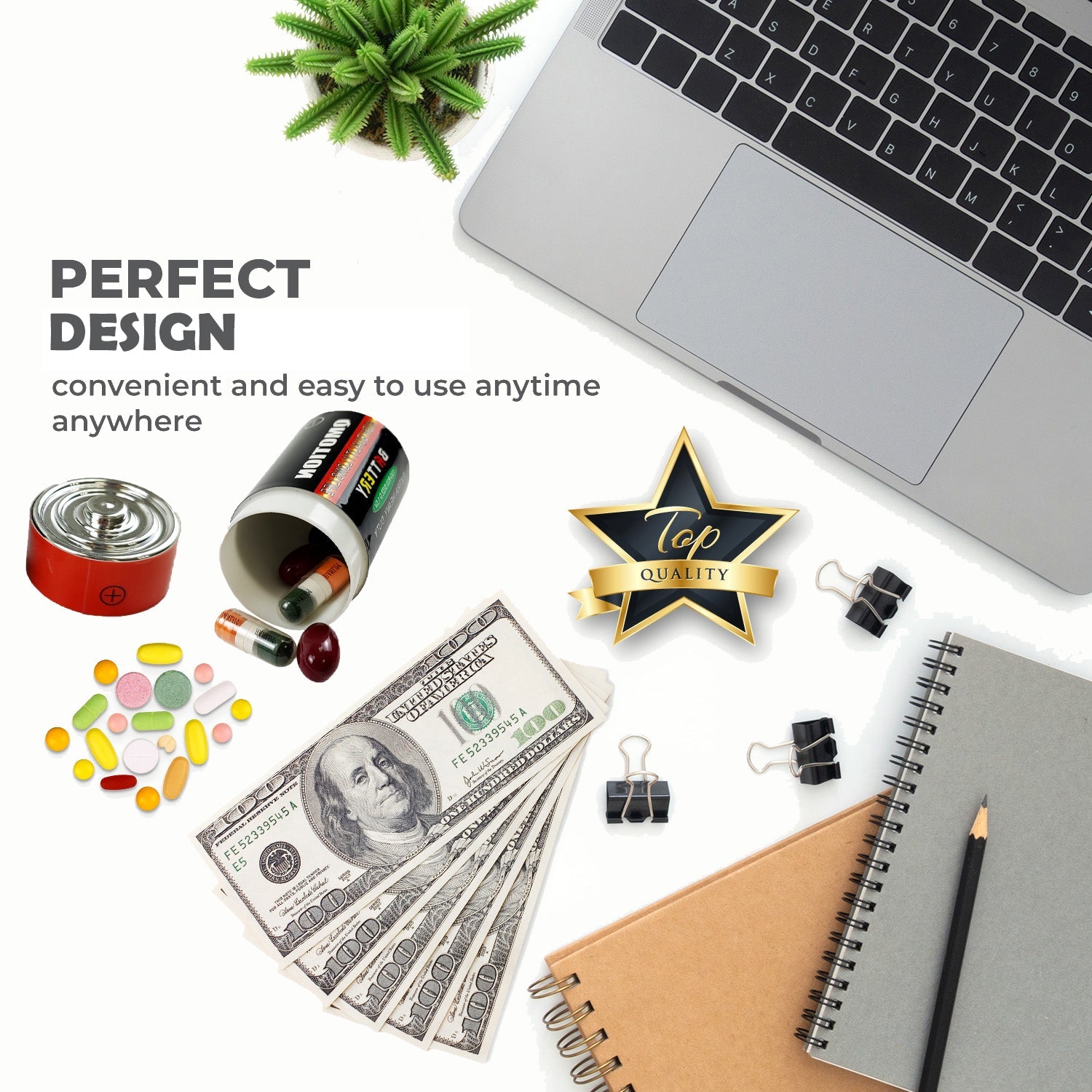 Discreet Design: Designed to look like a realistic battery while concealing a secret compartment inside.