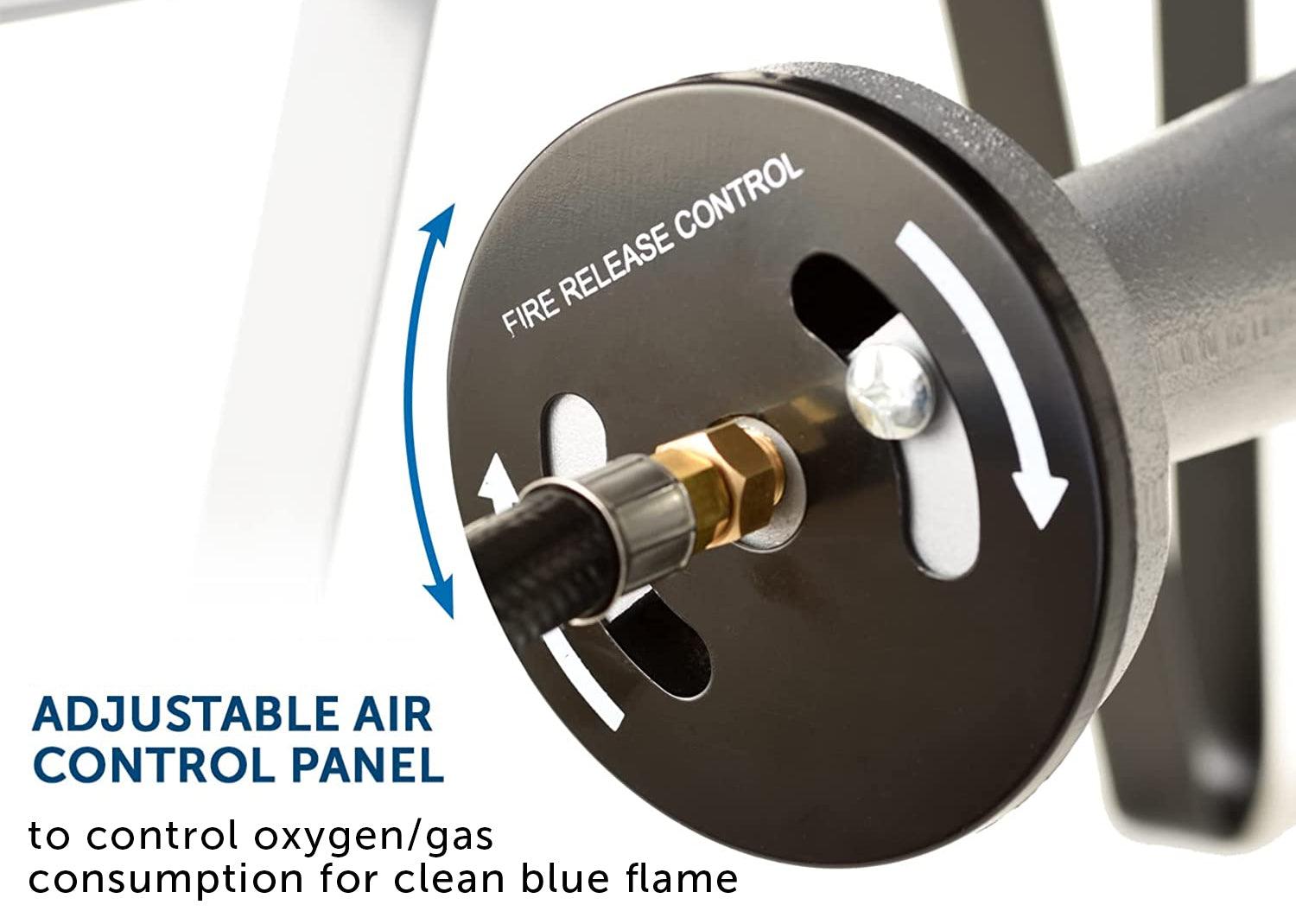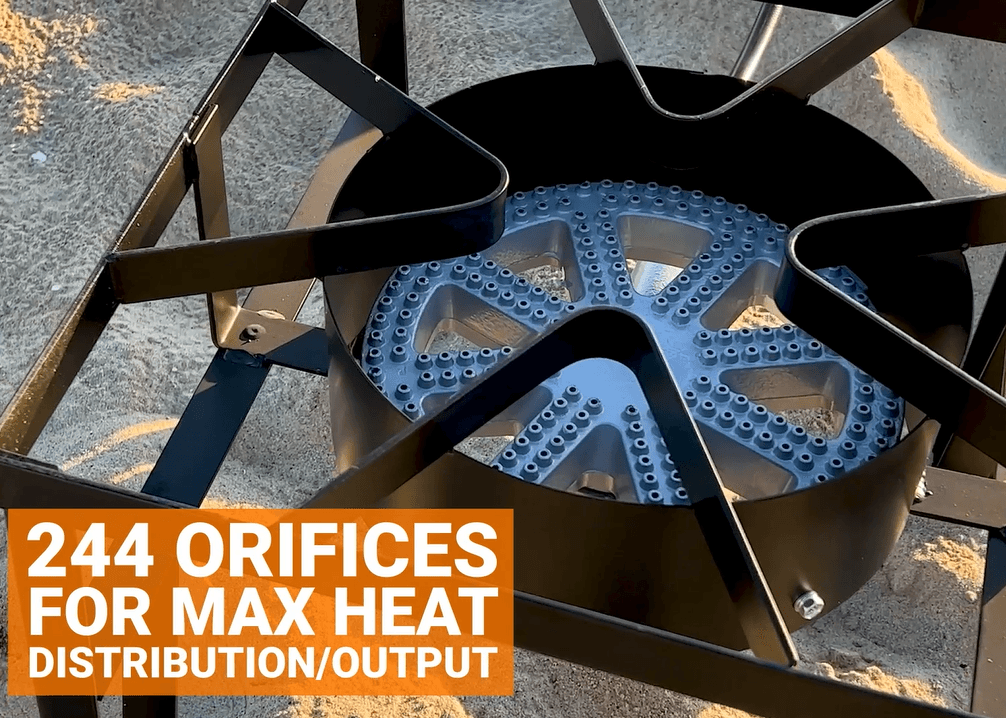 With an impressive 200,000 BTU output, this cast iron burner gives you full flame control through an adjustable gas regulating knob. Fine-tune your fire with the integrated air supply regulator ring to achieve a balanced, blue flame every time.