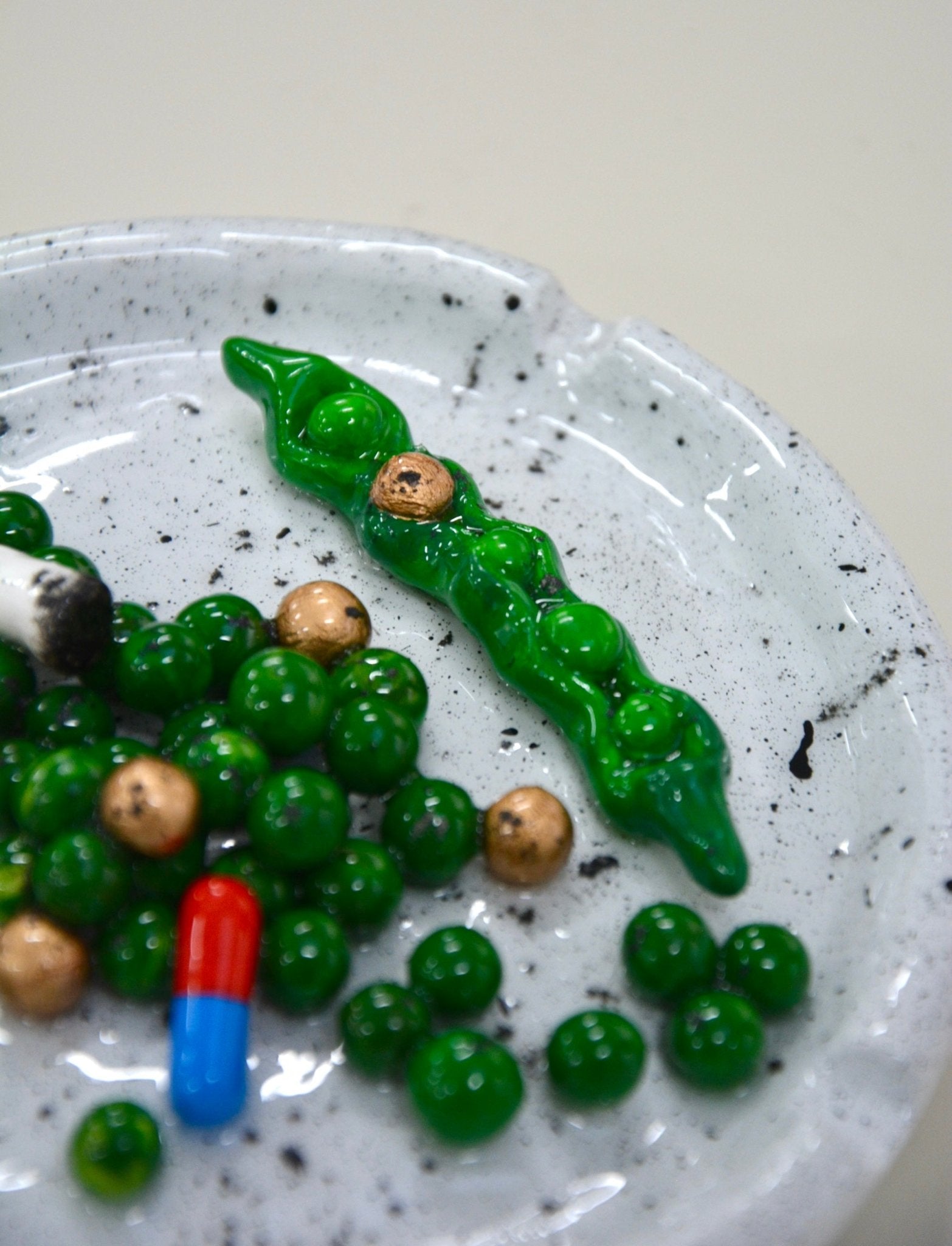 - Features: Marbled and metallic gold “peas”, light gray vessel with black speckles